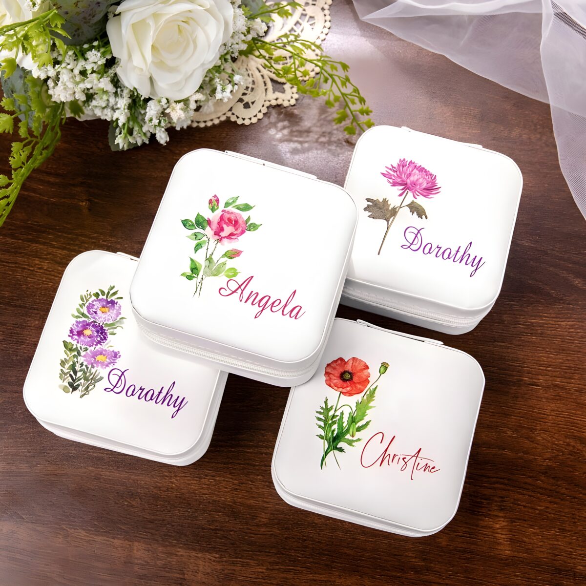🌷 Keep your precious jewelry safe and stylish with this custom birth flower jewelry travel case, perfect for bridesmaids, mothers, or anyone who cherishes meaningful keepsakes.