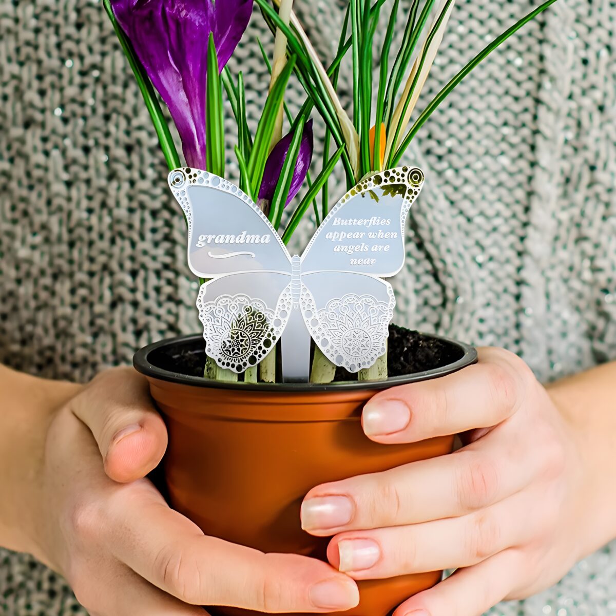 This delicate butterfly memorial stake is a heartfelt way to honor the cherished memory of a beloved mom or grandma who watches over from heaven. Designed to carry names and personal details, it transforms a gravesite or memorial garden into a place of peaceful remembrance and enduring connection.