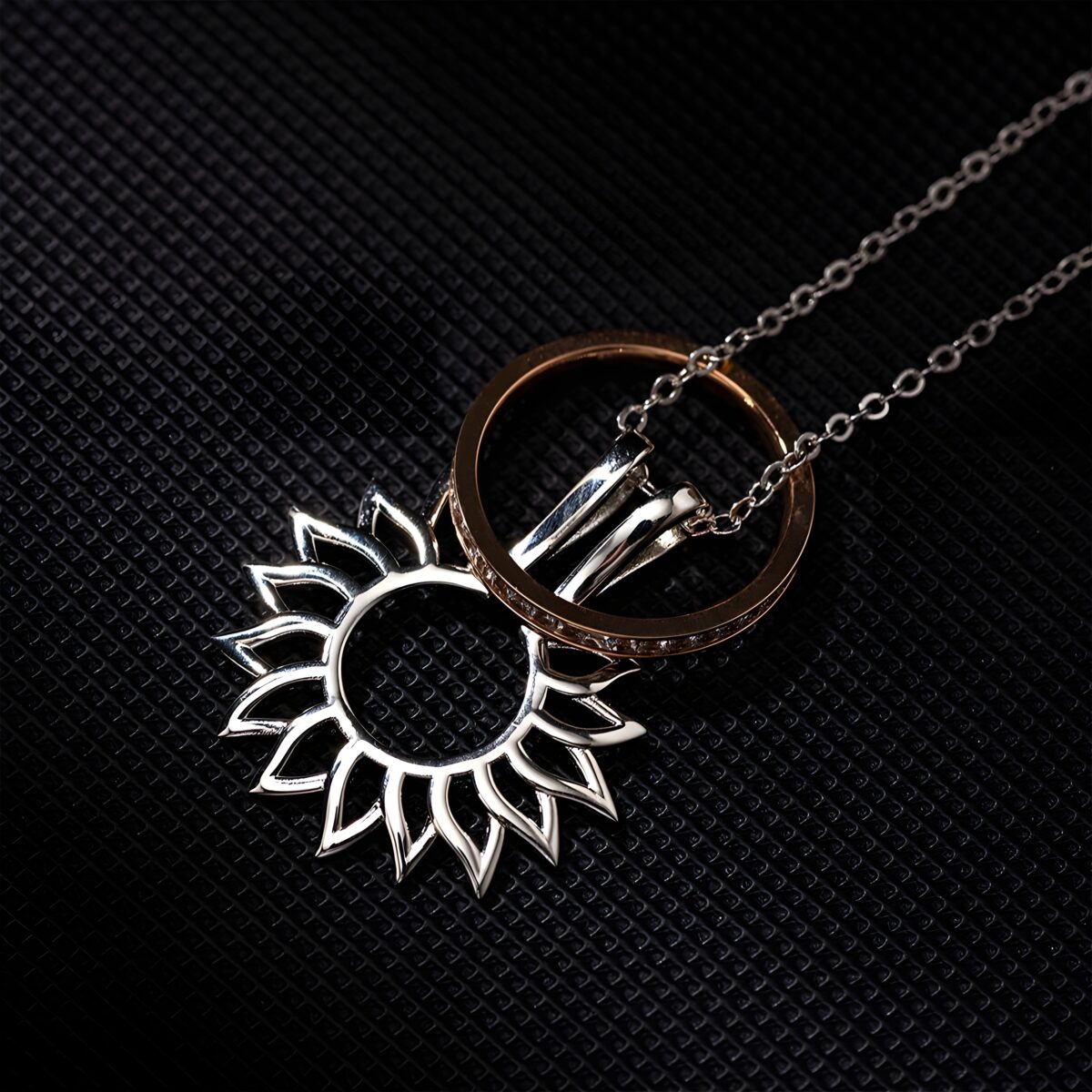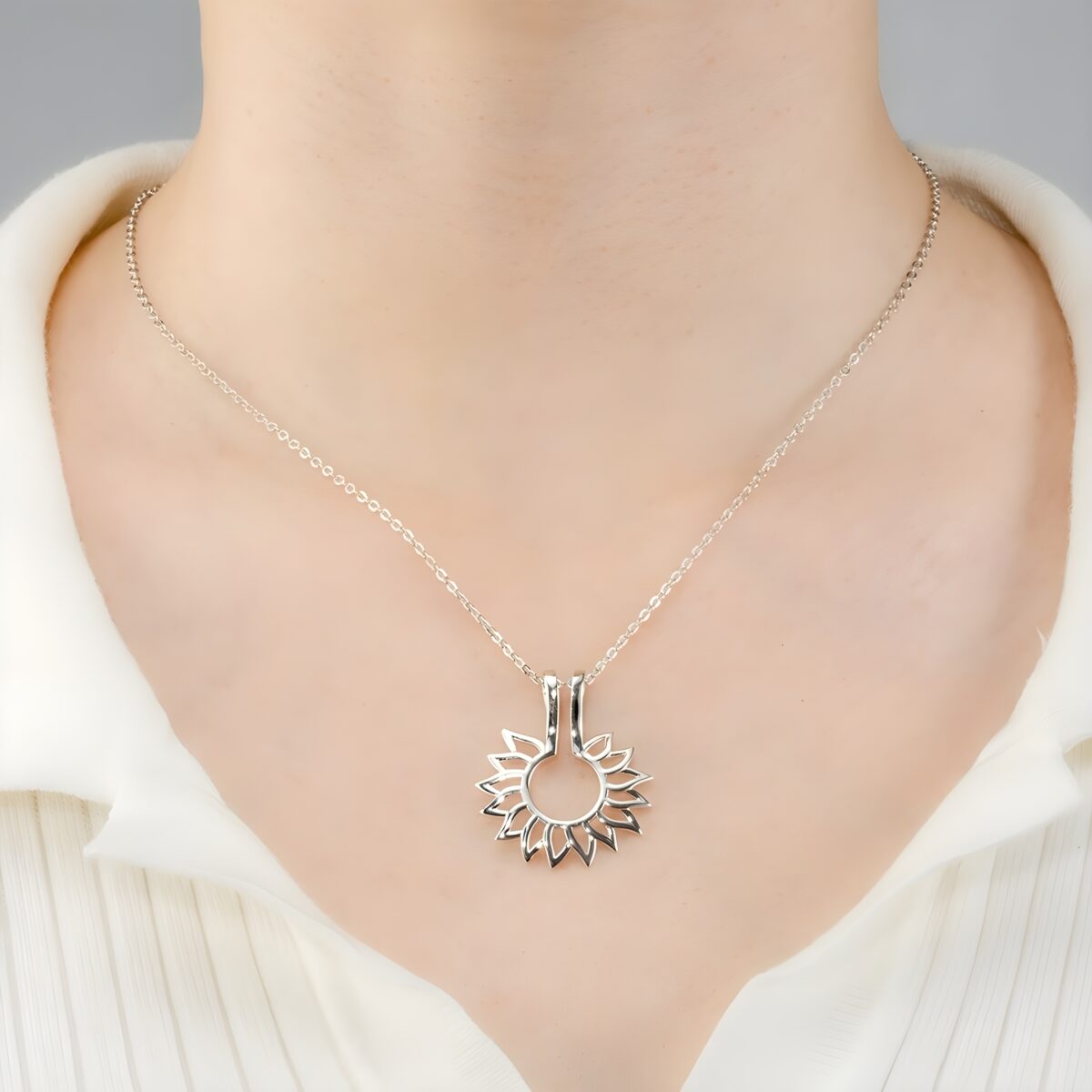 This delicate sterling silver necklace, adorned with an elegant flower design, is crafted for the woman who treasures both beauty and practicality. It offers a loving way to keep your cherished ring close to your heart when it’s not on your finger, symbolizing care, connection, and timeless grace.