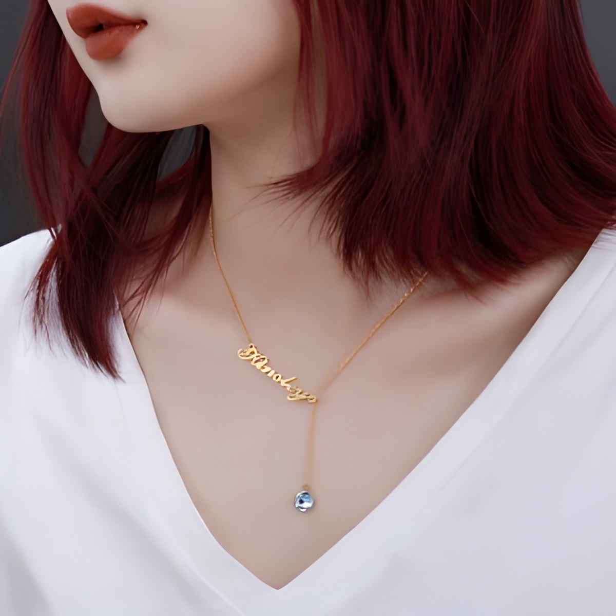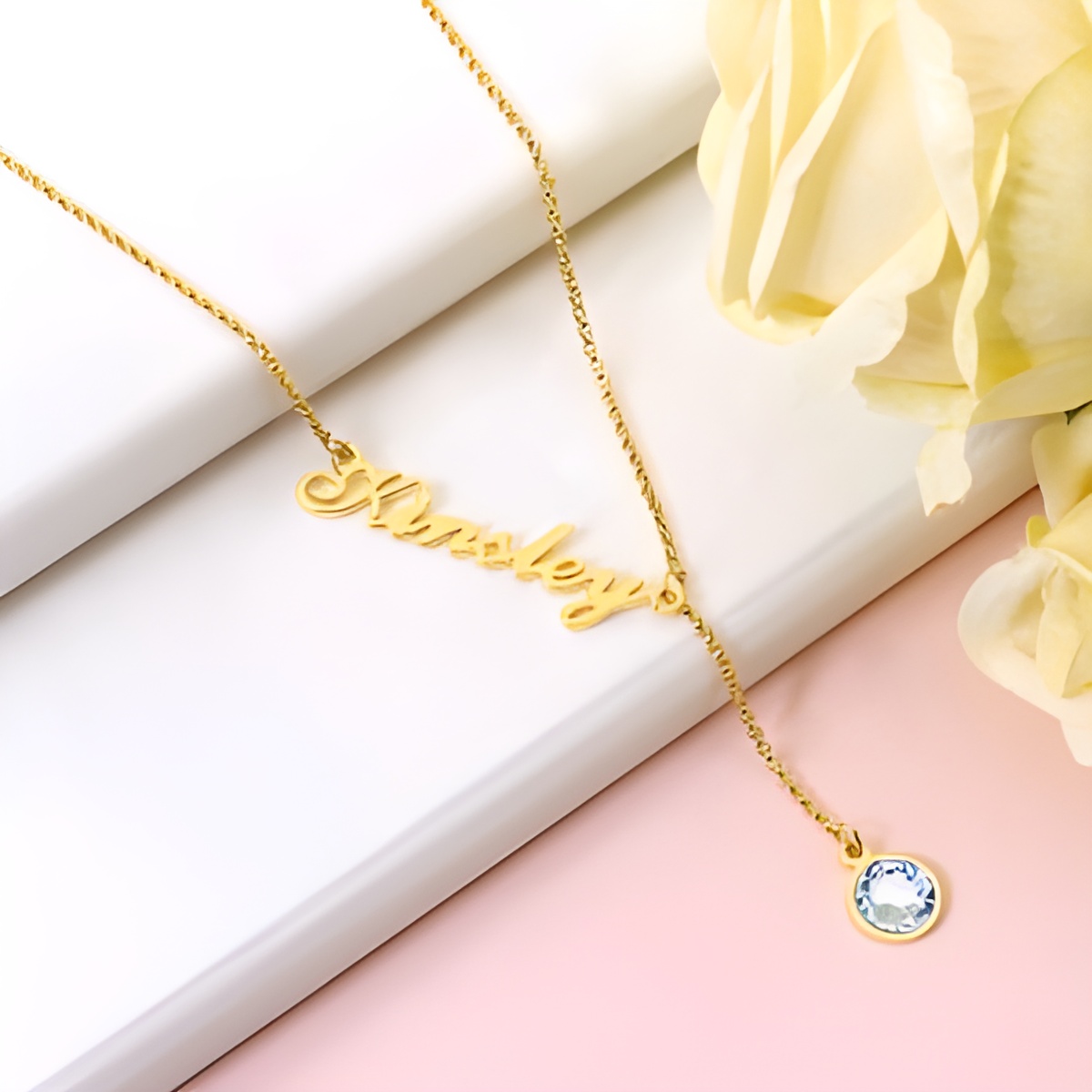 This delicate necklace is more than an accessory—it’s a heartfelt expression of identity and love. Crafted to carry your name alongside a meaningful birthstone, it honors personal stories and the special bonds with family and friends. Its graceful Y-shaped chain beautifully frames the collarbone, making it a timeless piece to treasure every day or on meaningful occasions.