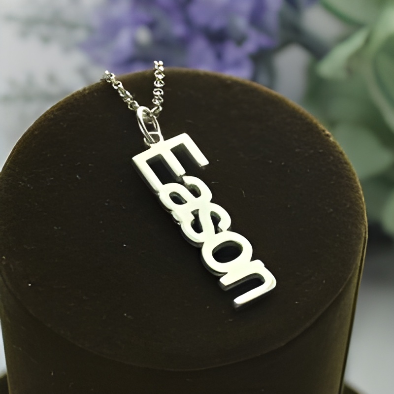 This vertical nameplate necklace is designed for those who cherish the beauty of individuality and personal expression. Crafted in gleaming sterling silver, it holds your name or a special word close to your heart, symbolizing identity, connection, and timeless elegance.