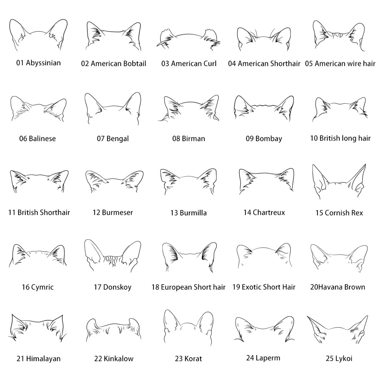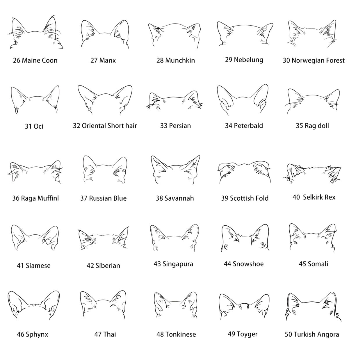 Choose an option 01 Abyssinian 02 American Bobtail 03 American Curl 04 American Short Hair 05 American Wire Hair 06 Balinese 07 Bengal 08 Birman 09 Bombay 10 British Long Hair 11 British Short Hair 12 Burmeser 13 Burmilla 14 Chartreux 15 Cornish Rex 16 Cymric 17 Donskoy 18 European Short Hair 19 Exotic Short Hair 20 Havana Brown 21 Himalayan 22 Kinkalow 23 Korat 24 Laperm 25 Lykoi 26 Maine Coon 27 Manx 28 Munchkin 29 Nebelung 30 Norwegian Forest 31 Oci 32 Oriental Short Hair 33 Persian 34 Peterbald 35 Rag Doll 36 Raga Muffinl 37 Russian Blue 38 Savannah 39 Scottish Fold 40 Selkirk Rex 41 Siamese 42 Siberian 43 Singapura 44 Snowshoe 45 Somali 46 Sphynx 47 Thai 48 Tonkinese 48 Tonkinese 50 Turkish Angora