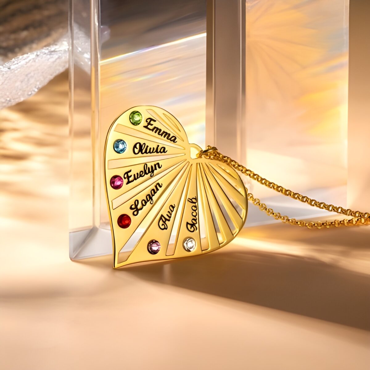 This exquisite split heart necklace is designed for families bound by love and connection. Each segment of the heart represents a cherished family member, adorned with their name and unique birthstone, bringing warmth and light to your shared story.