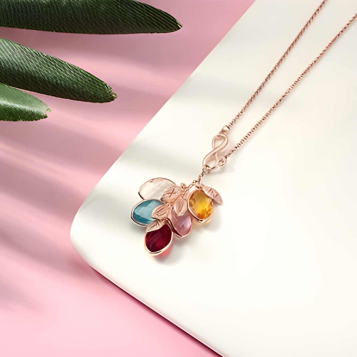 This exquisite necklace is designed for those who hold family close to their heart. Featuring an elegant infinity symbol intertwined with delicate leaf-shaped birthstones, it beautifully symbolizes the unbreakable bond and timeless connection shared between loved ones. Personalize it with your chosen birthstone colors and initials to create a truly unique treasure that reflects your family’s story.