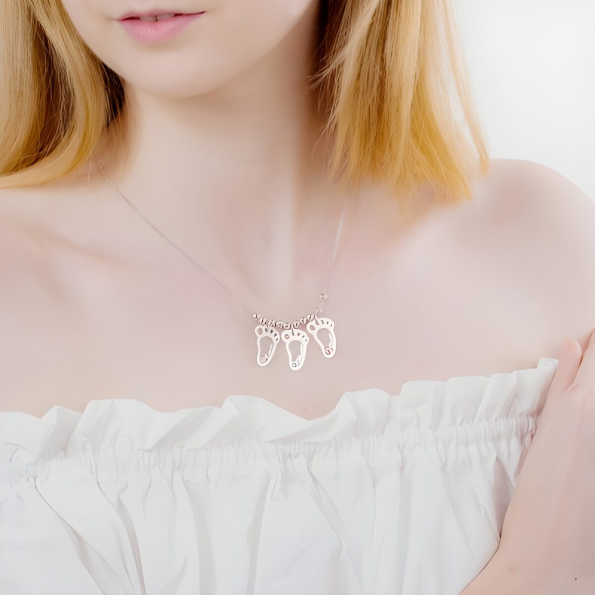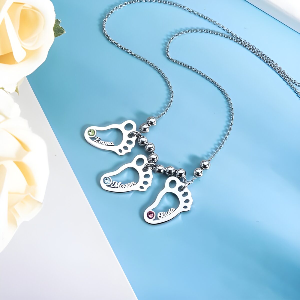 This exquisite necklace is designed for mothers who treasure the unique bond with their children. Each delicate hollow foot charm represents a beloved child, making this piece a heartfelt symbol of family and love. Adorned with birthstones, it captures the beauty and meaning of each child’s arrival, keeping them close to a mother’s heart every day.