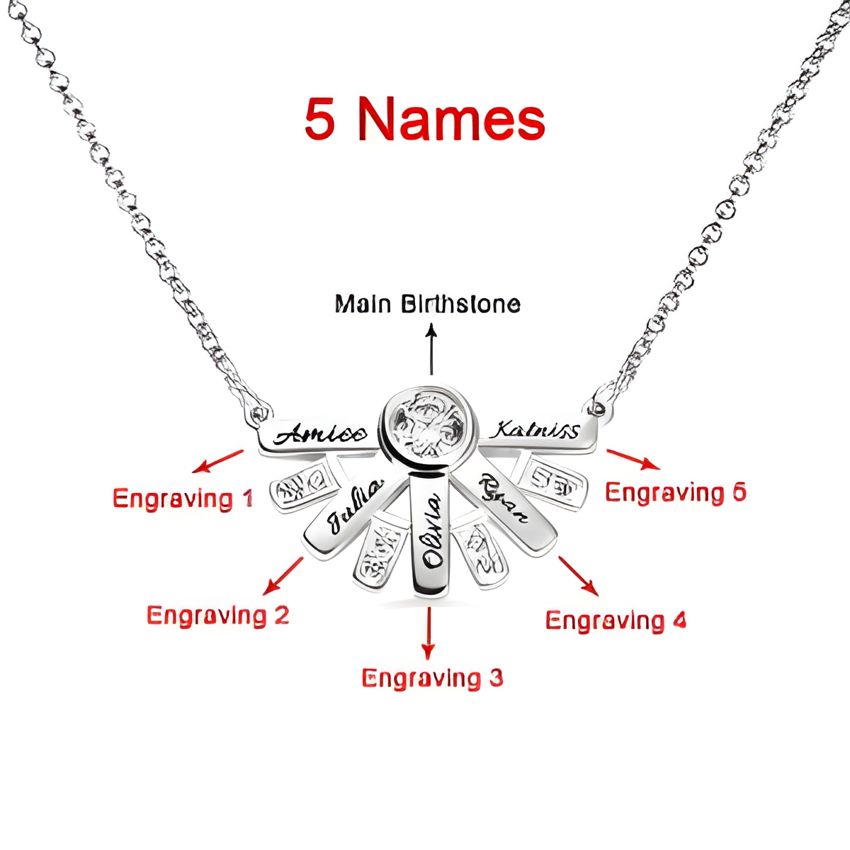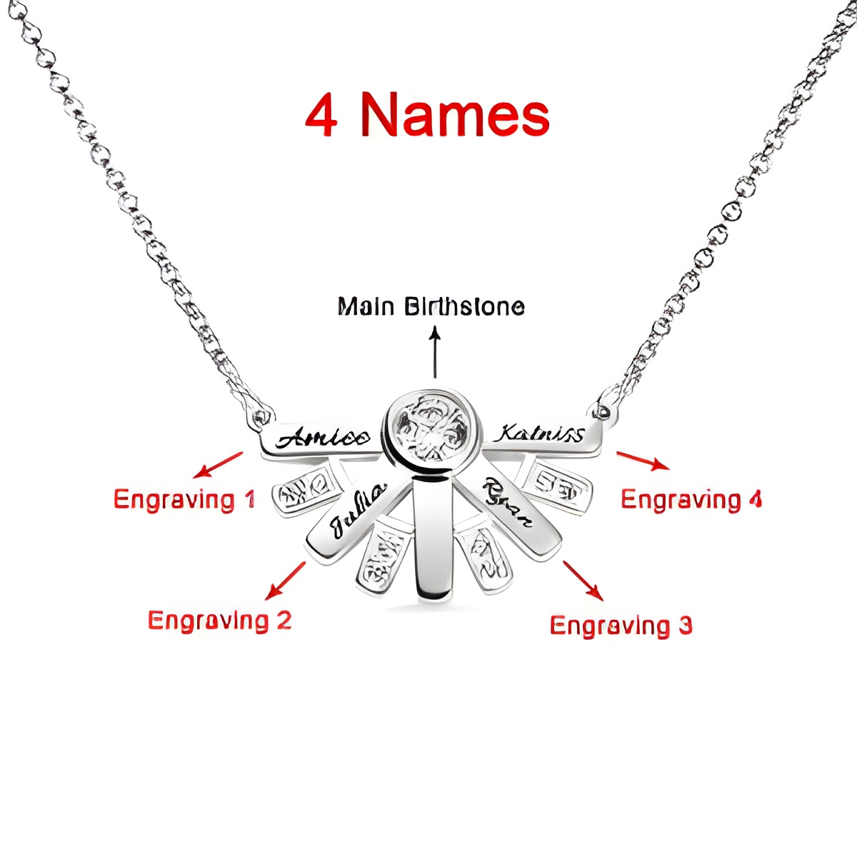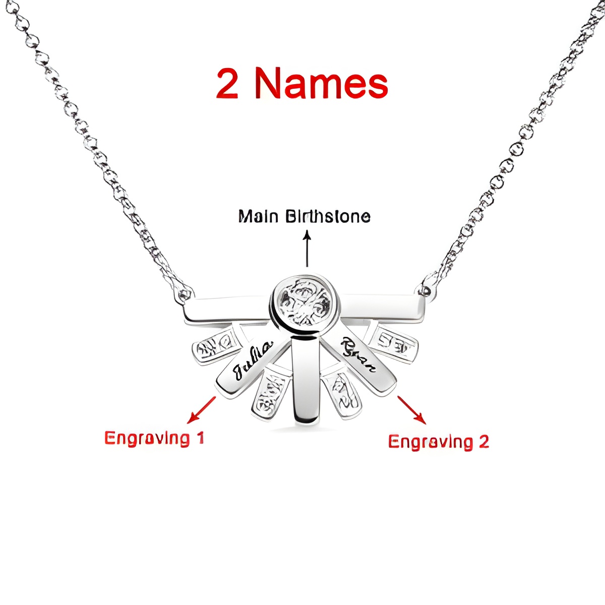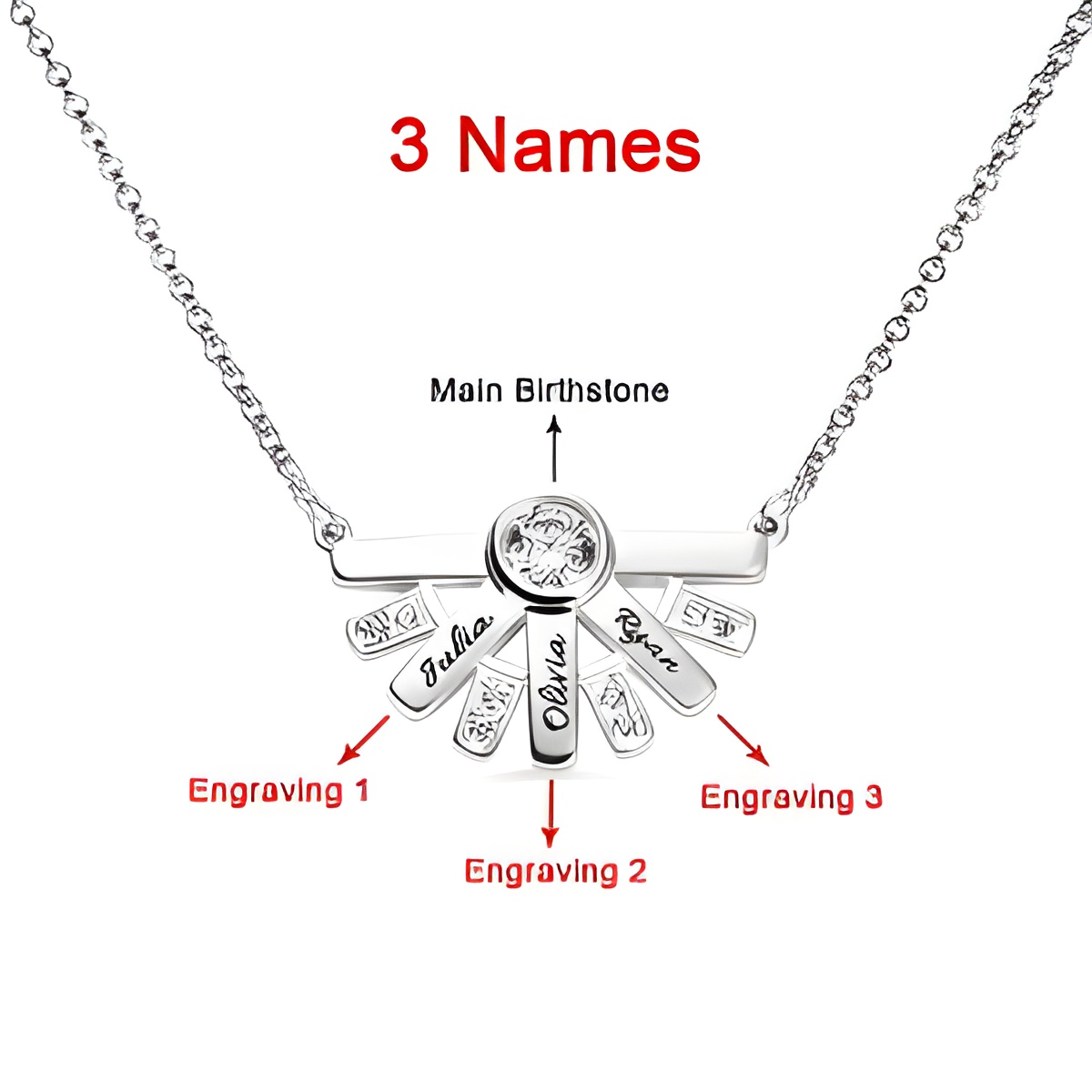 ☀️ Celebrate the bond of family with this sterling silver birthstone necklace featuring engraved names and a radiant sun design.
