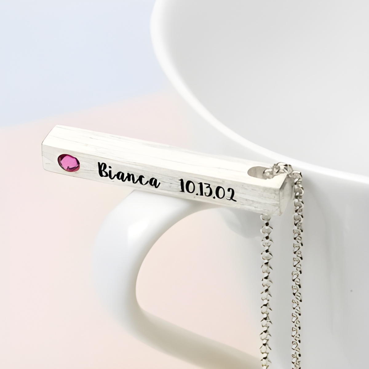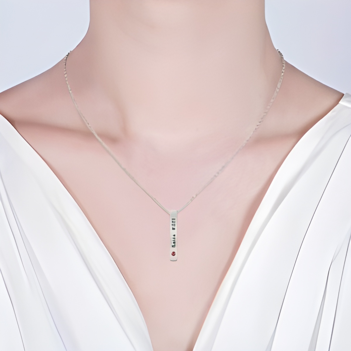 ✨ Carry your story with this four-sided sterling silver bar necklace featuring engraved names and birthstones for a truly personal touch.