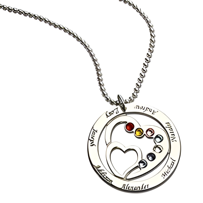 This exquisite sterling silver necklace is designed for the mother who carries her children’s love everywhere she goes. Featuring a delicate heart within a heart, it beautifully symbolizes the unbreakable bond between a mother and her family. Each name and birthstone engraved on this pendant tells a story of cherished moments and lasting connection.
