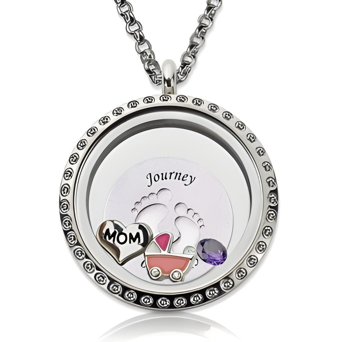 • 🌸 Everyday Joy – The floating charms, including a “MOM” charm, a stroller charm in pink or blue, and a birthstone, dance freely inside the locket, adding a playful, elegant touch.