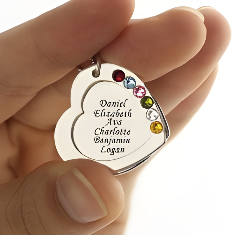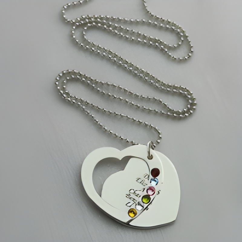 💖 Celebrate a mother’s love with this heart family names necklace with birthstones, crafted to hold the names and birthstones of her children close to her heart.