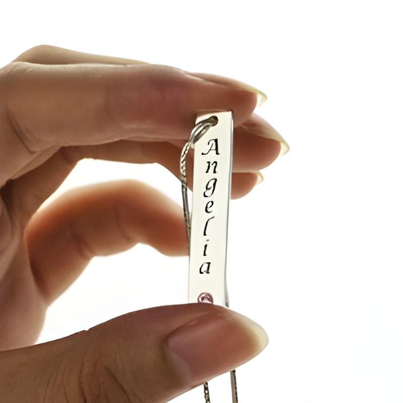 This exquisite vertical bar necklace is more than just jewelry; it’s a heartfelt expression of identity and love. Crafted to carry her name alongside a delicate birthstone, it becomes a cherished keepsake that celebrates her individuality and the special moments you share.