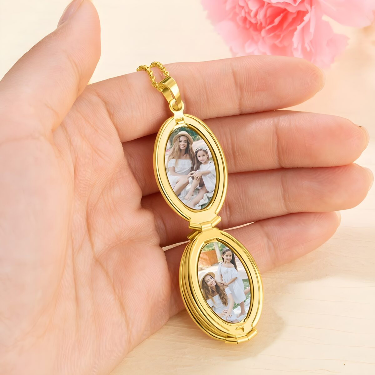 This elegant oval locket necklace is designed for those who wish to carry their most cherished moments wherever they go. Crafted to hold up to four precious photos, it becomes a heartfelt symbol of love, connection, and remembrance for moms, grandmothers, family, and dear friends.