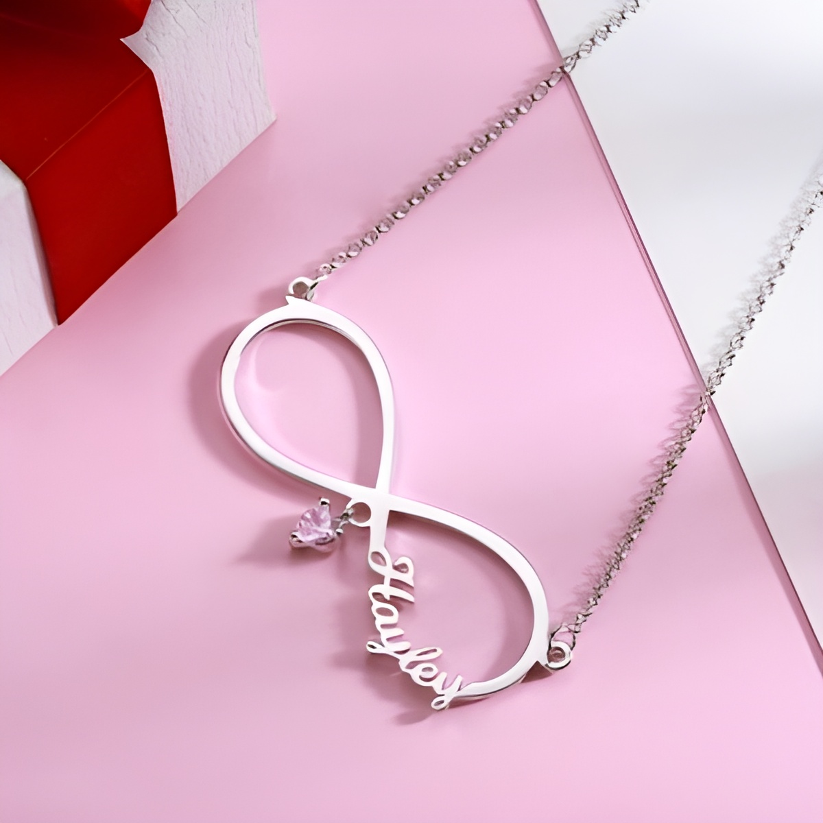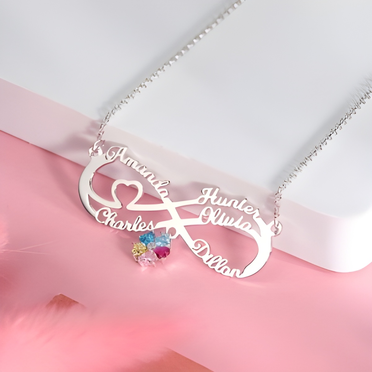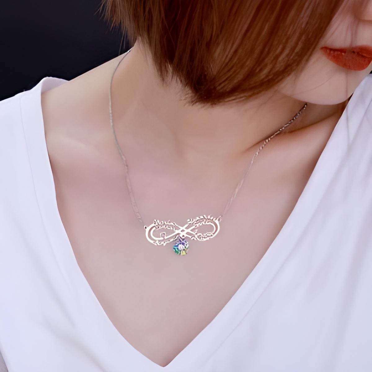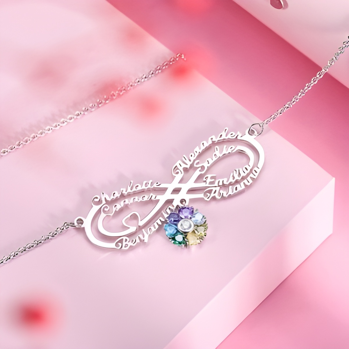 This delicate infinity necklace is a heartfelt symbol of endless love, personalized to honor the special names and birthstones of those closest to your heart. Ideal for family members or loved ones, it captures timeless connections in a beautifully crafted sterling silver design.