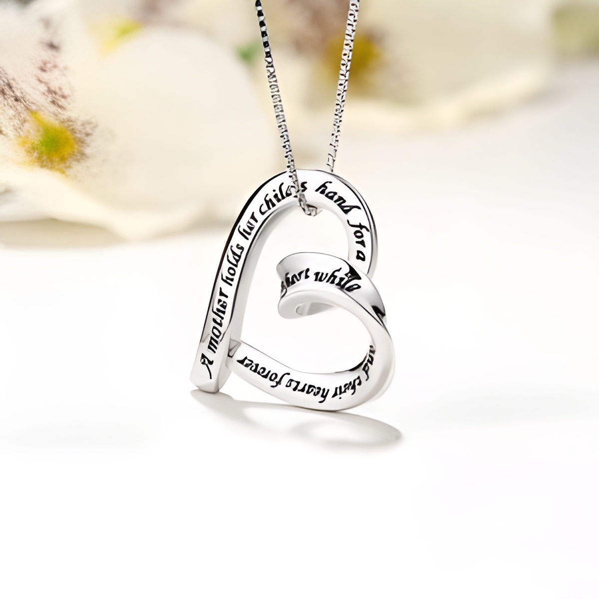 This beautifully crafted heart necklace is designed to celebrate the unbreakable bond between a mother and her child. Engraved with a heartfelt phrase, it carries the timeless message that a mother’s love lasts forever, making it a meaningful keepsake for new moms or any mother cherishing her special connection.