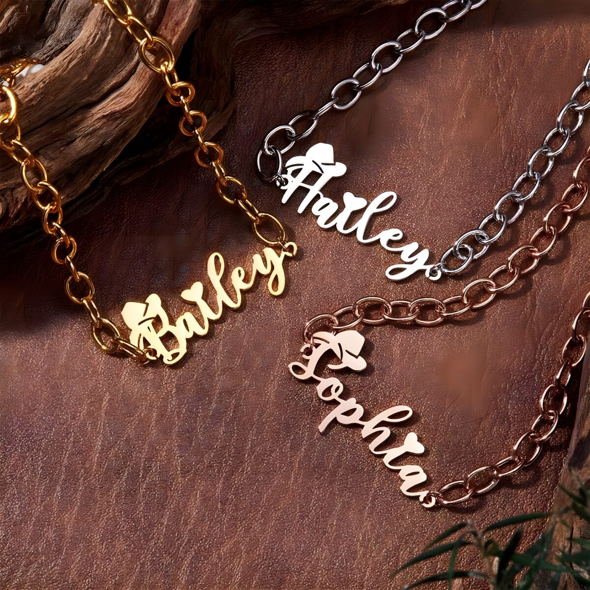 This charming bracelet is designed for those who carry the heart and soul of the cowboy or cowgirl lifestyle. With a personalized name and a delicate cowboy hat charm, it tells a story of adventure, freedom, and timeless Western heritage. Whether for yourself or someone special, it’s a meaningful way to honor a love for the open range and the spirit that rides within.