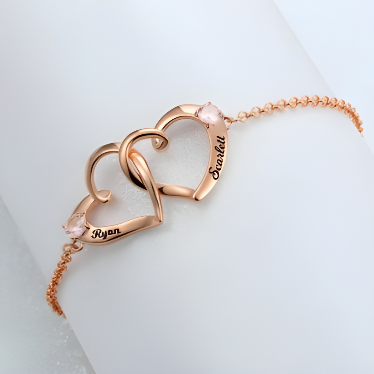 💞 Celebrate your special bond with this double heart engraved name bracelet in rose gold, featuring sparkling birthstones for a meaningful touch.