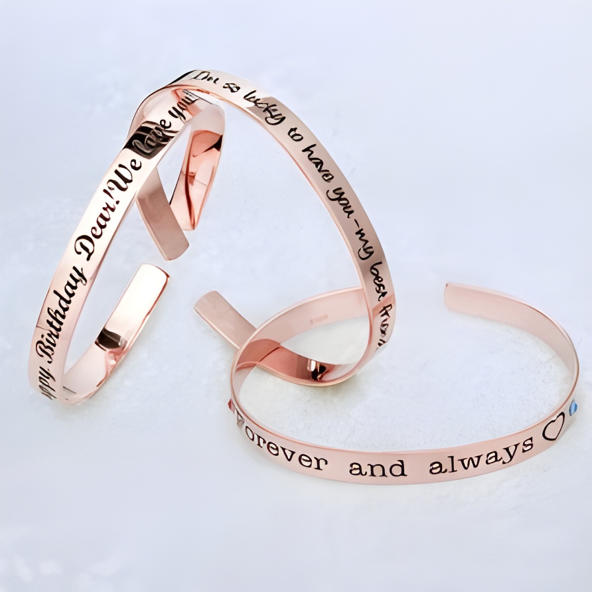 This delicate rose gold bangle is more than just an accessory—it’s a meaningful keepsake designed to hold the words and memories closest to your heart. Whether celebrating a milestone or honoring a special bond, its elegant engraving and shimmering birthstones make it a timeless expression of love and connection.
