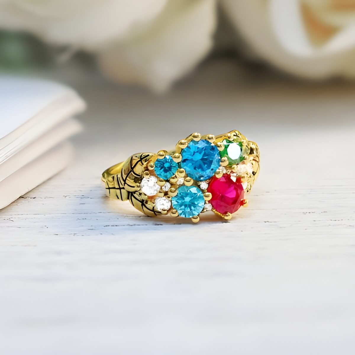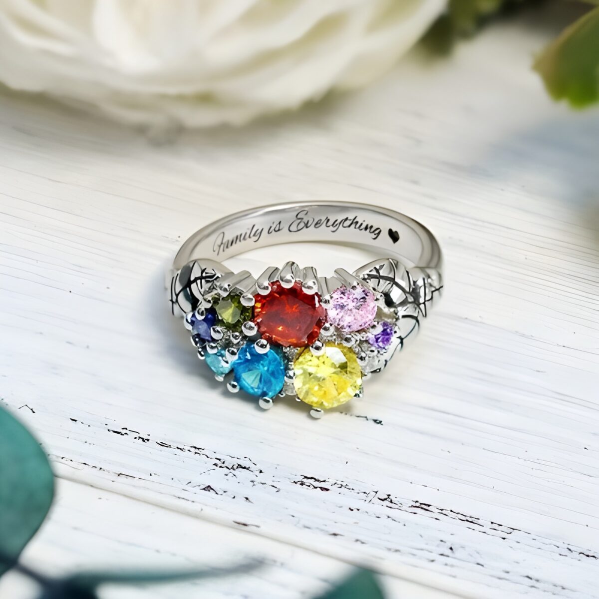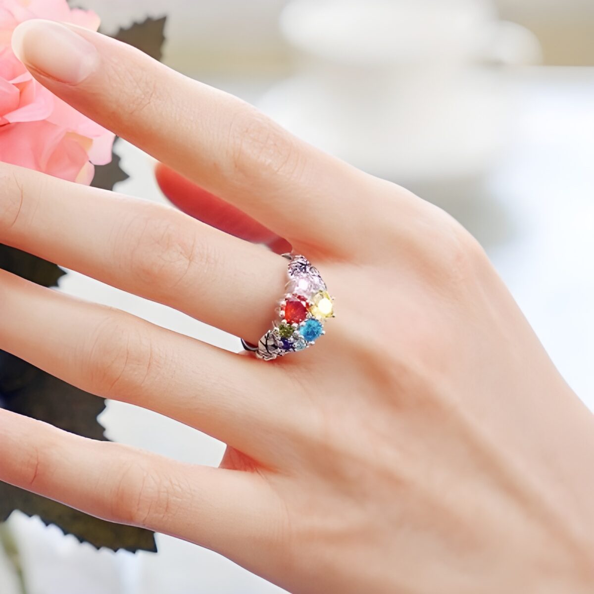 This exquisite birthstone ring is a tender tribute to the love and joy a mother nurtures within her family. Designed as a vibrant garden of colorful gems, it symbolizes the happiness and unity that blossoms through each family member’s unique presence.