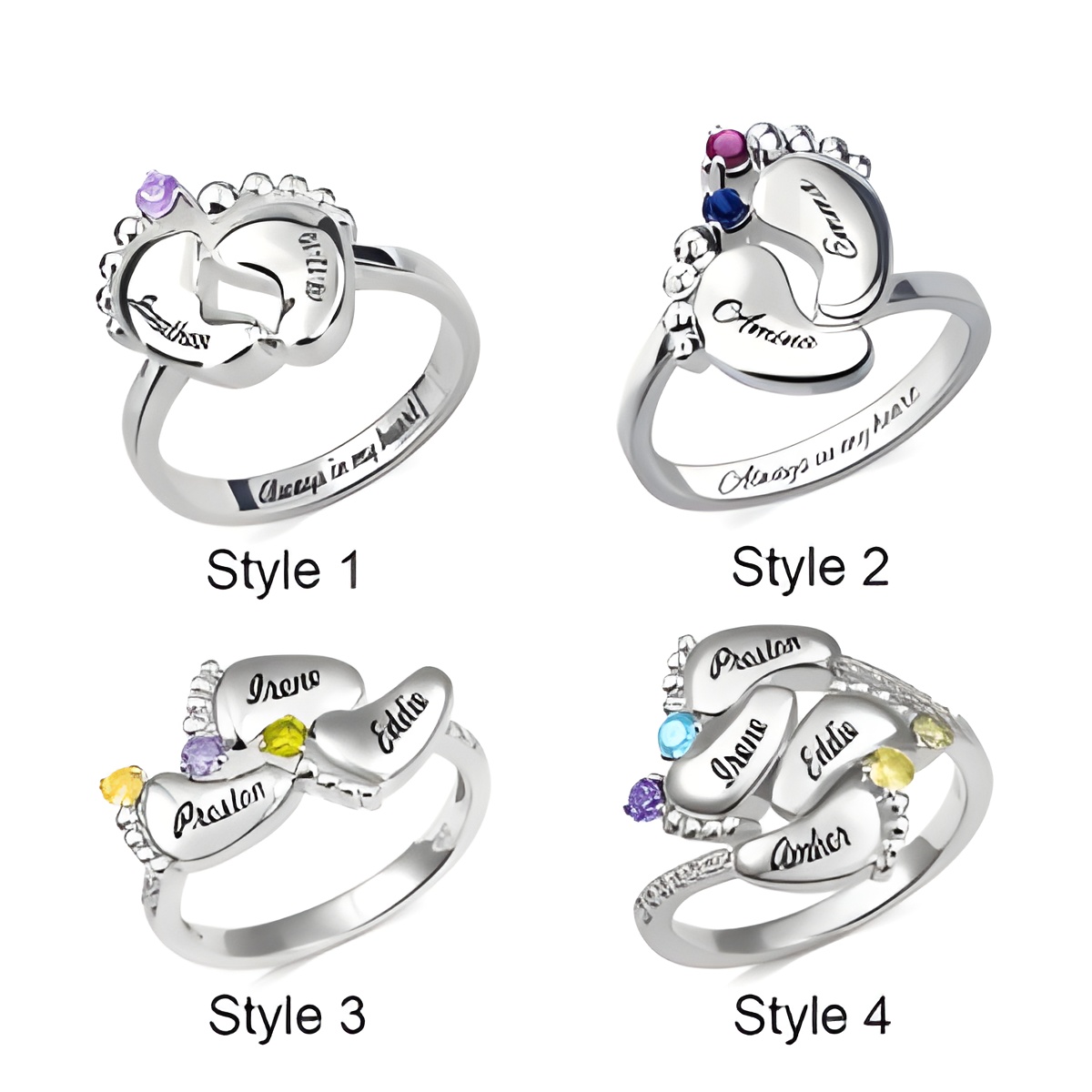 Style: Personalized Rings Material: Sterling Silver 925 Thickness of Ring: 2MM (0.8 inch) Baby Feet Size: Style 1 – 1.5 x 1.4 CM (0.6 x 0.56 inch), Style 2 – 1.65 x 1.65 CM (0.66 x 0.66 inch), Style 3 – 1.6 x 1.8 CM (0.63 x 0.71 inch), Style 4 – 2.1 x 1.3 CM (0.83 x 0.51 inch) Birthstone Size: 2.5MM (0.1 inch) Font Styles: Style 2 / Styles 1, 3, 4