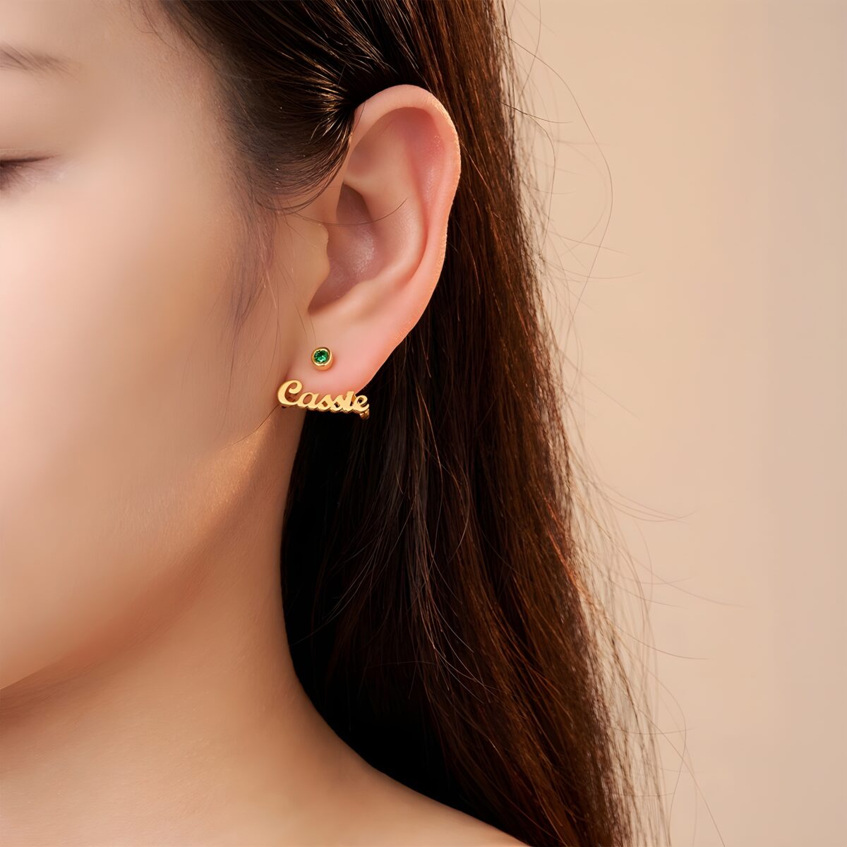 These wrap-around earrings are designed for the woman who treasures meaningful adornments. Featuring a delicate curve that beautifully showcases a personalized name charm paired with a radiant birthstone, they capture the essence of personal stories and heartfelt connections.