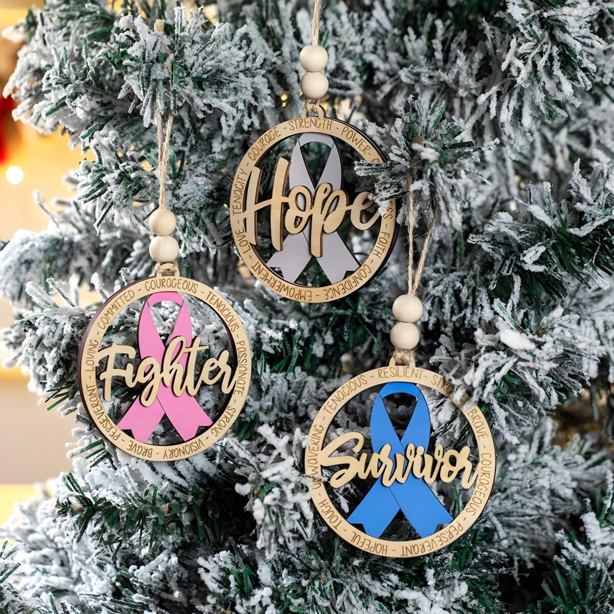 🎗️ Celebrate courage with these wooden cancer awareness ornaments featuring inspiring themes of hope, fighter, and survivor for your holiday décor.