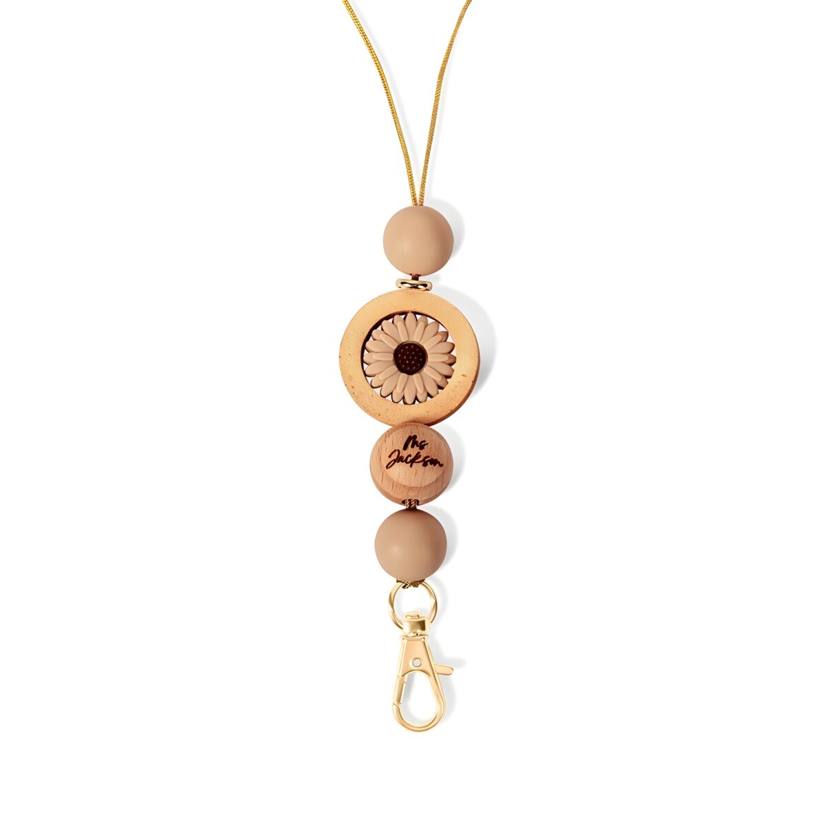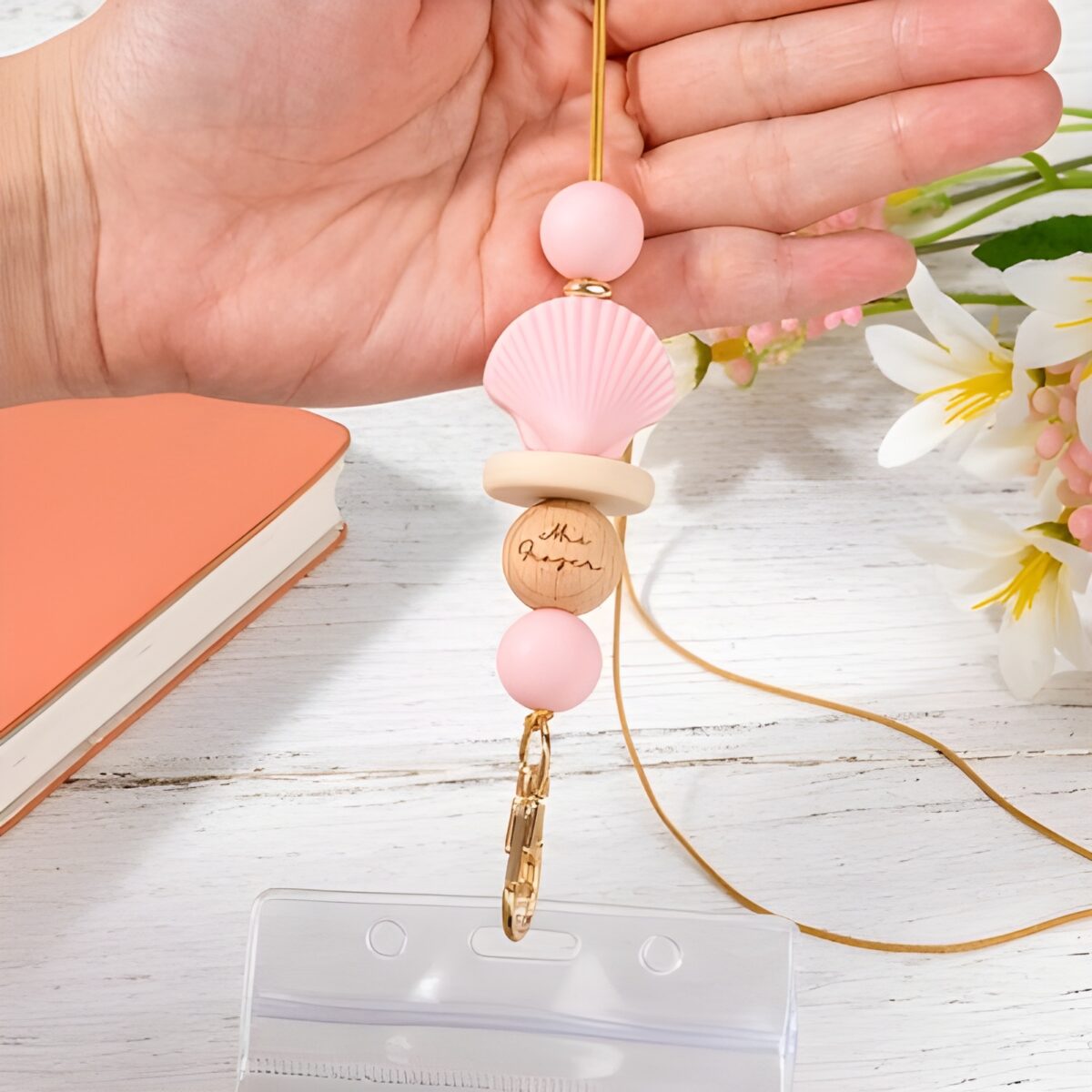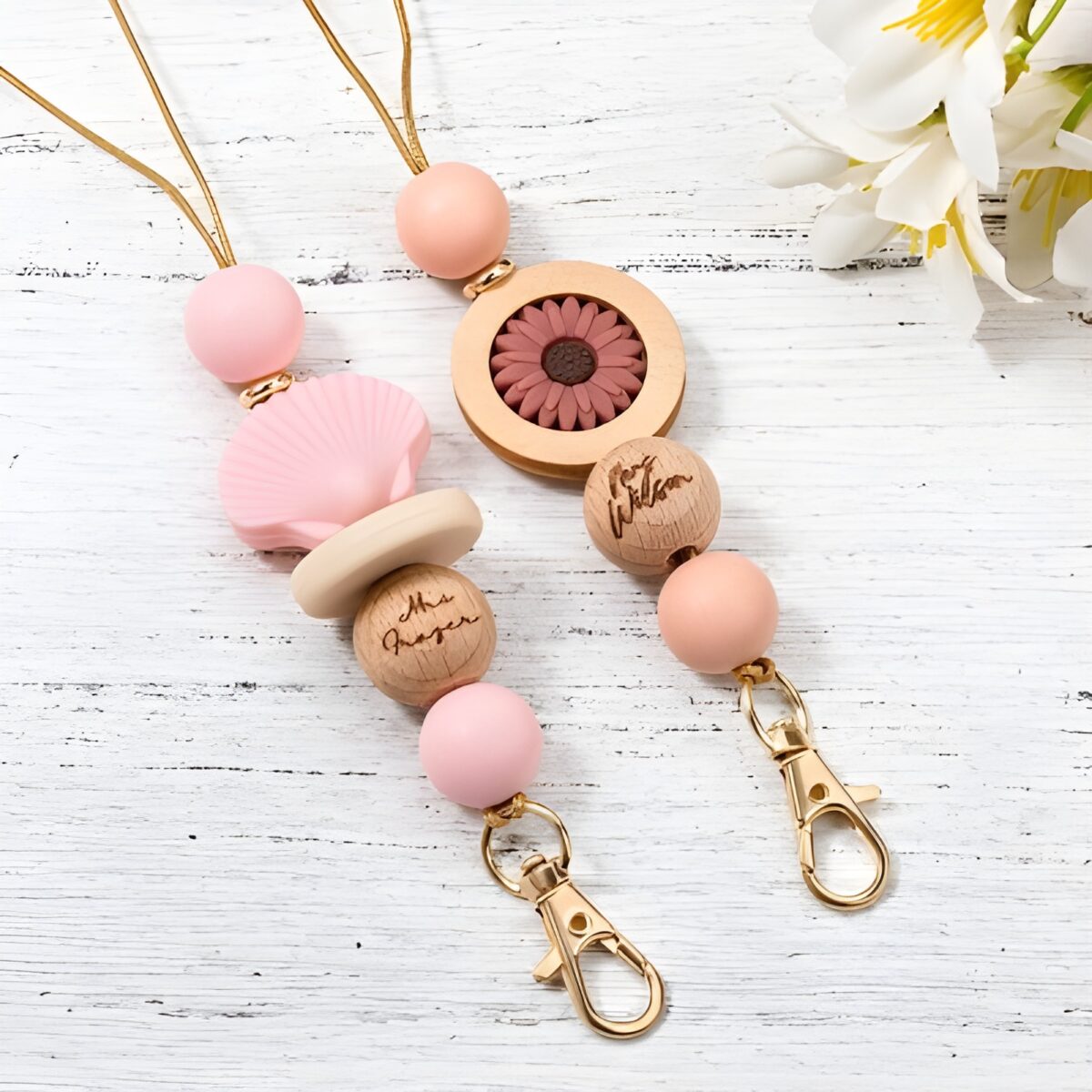 🌿 Discover the charm of this custom name beaded lanyard featuring a delicate boho floral wooden pendant, perfect for adding a personal touch to everyday essentials.