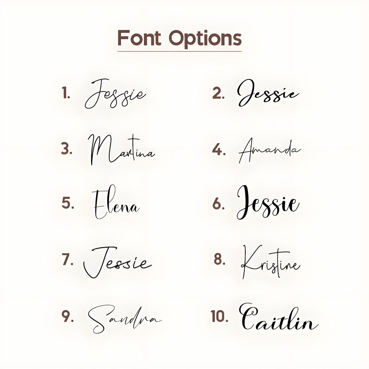 Customization Options: 7 color choices, 12 birth flowers, 10 font styles