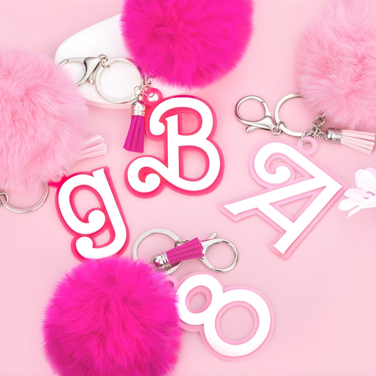 Carry Your Initial with Charm – Personalized Pink Acrylic Keychain with Tassel & Pom Pom – Delight for Girls and Friends