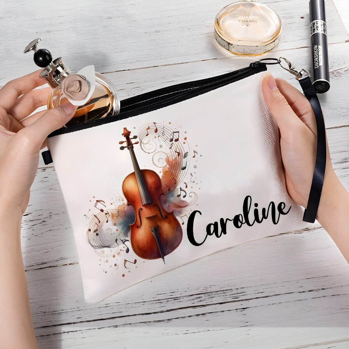 🎼 Embrace your passion with this custom linen musician’s cosmetic pouch, featuring musical instrument designs and a personalized name for a truly unique touch.