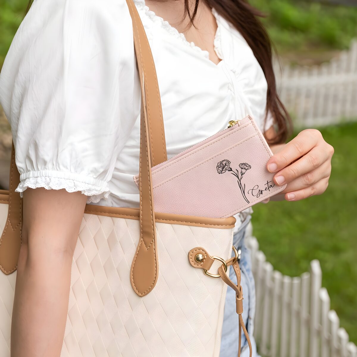 This elegant zipped card holder is more than just a wallet—it’s a personal expression of identity and style. Crafted to carry your essentials with grace, it features a custom birth flower and name, making it a meaningful companion for the woman who treasures individuality and beauty in everyday moments.