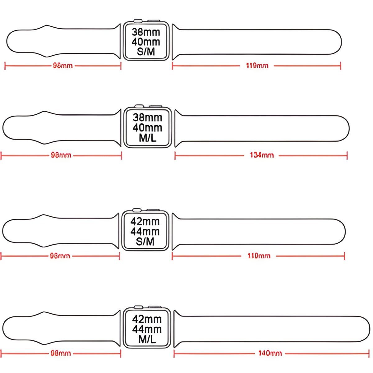 Measurements: 38/40MM (S/M): 208MM (8.2INCH); 38/40MM (M/L): 232MM (9.1INCH); 42/44MM (S/M): 217MM (8.5INCH); 42/44MM (M/L): 238MM (9.4INCH)
