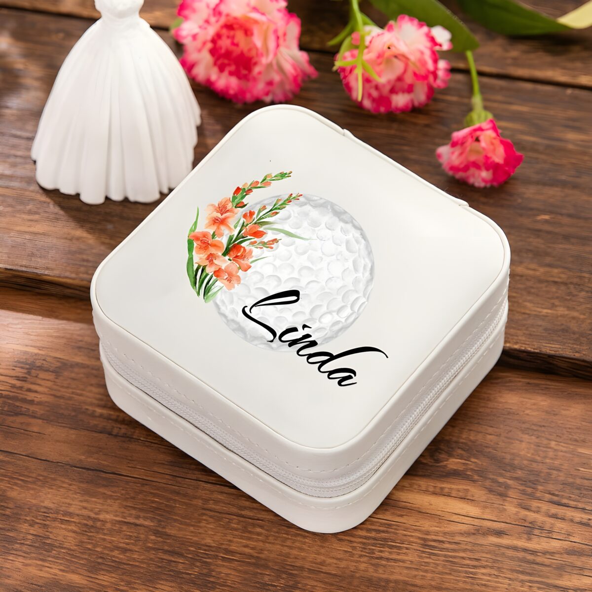 This elegant jewelry box is designed for the woman who cherishes both her personal style and her passion for golf. Featuring a personalized name alongside her birth flower, it transforms a simple accessory into a heartfelt treasure that reflects her story and spirit.