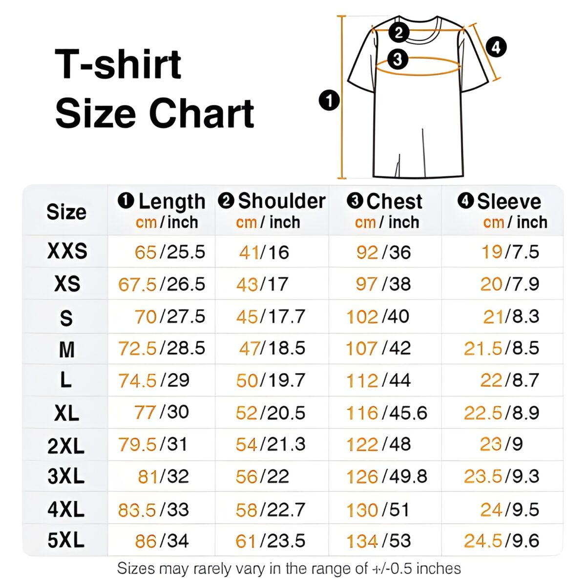 Measurements: XXS, XS, S, M, L, XL, 2XL, 3XL, 4XL, 5XL