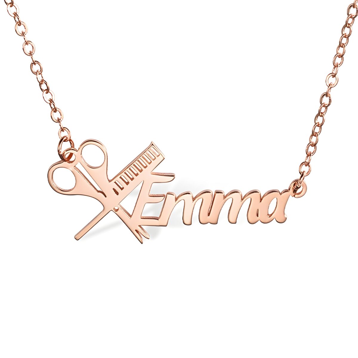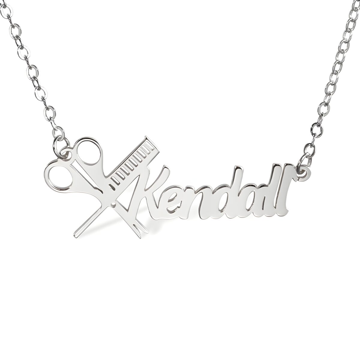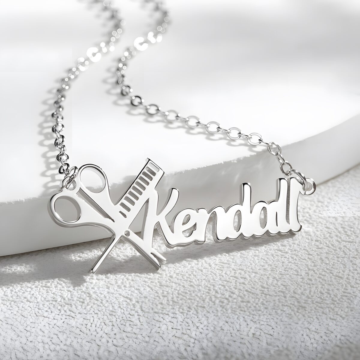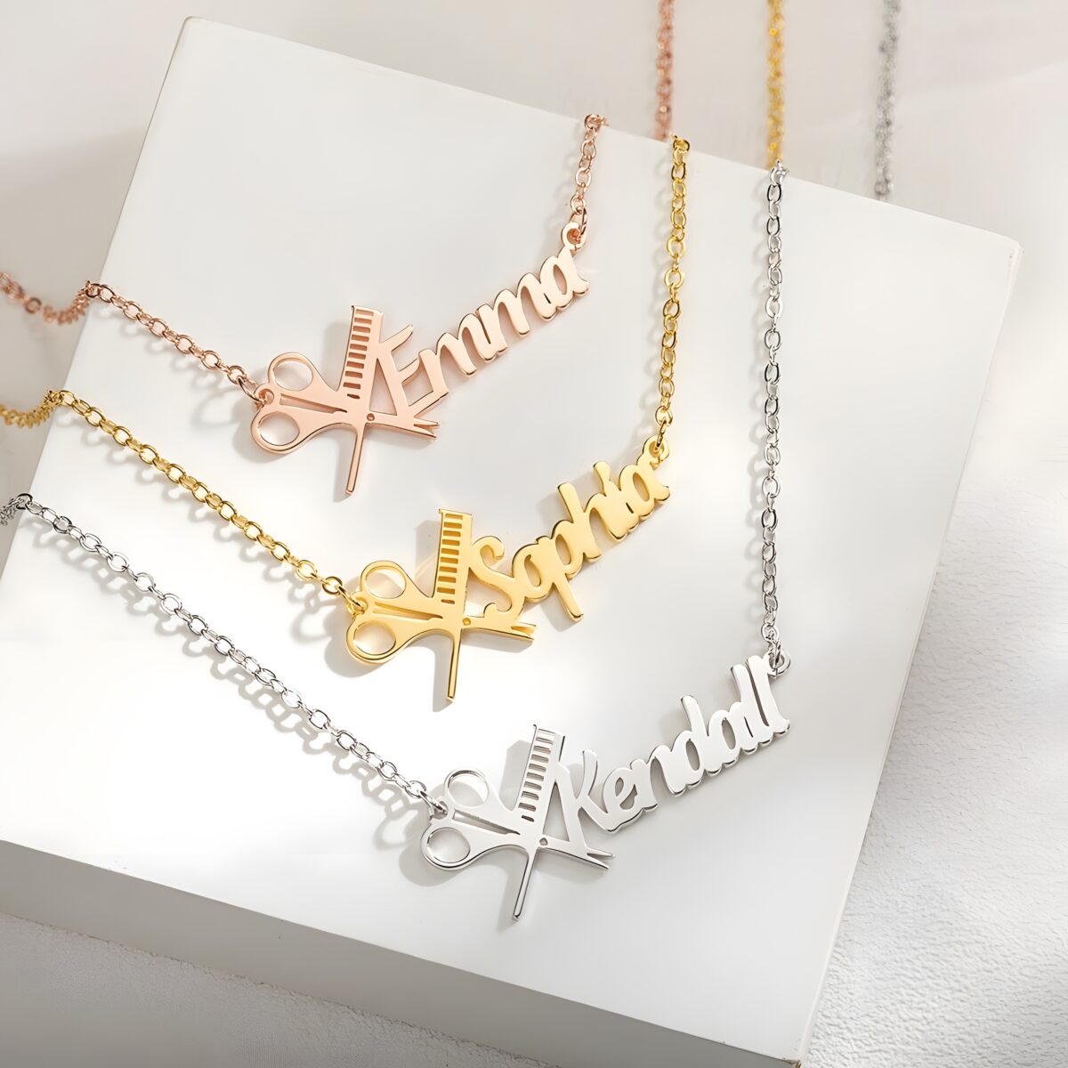 This elegant necklace is designed for the hairstylist, barber, or salon artist who carries their craft close to heart. Featuring a delicate scissors and comb motif, it honors the skill and creativity that define your profession. Personalized with your name, this piece becomes a unique emblem of your dedication and passion.