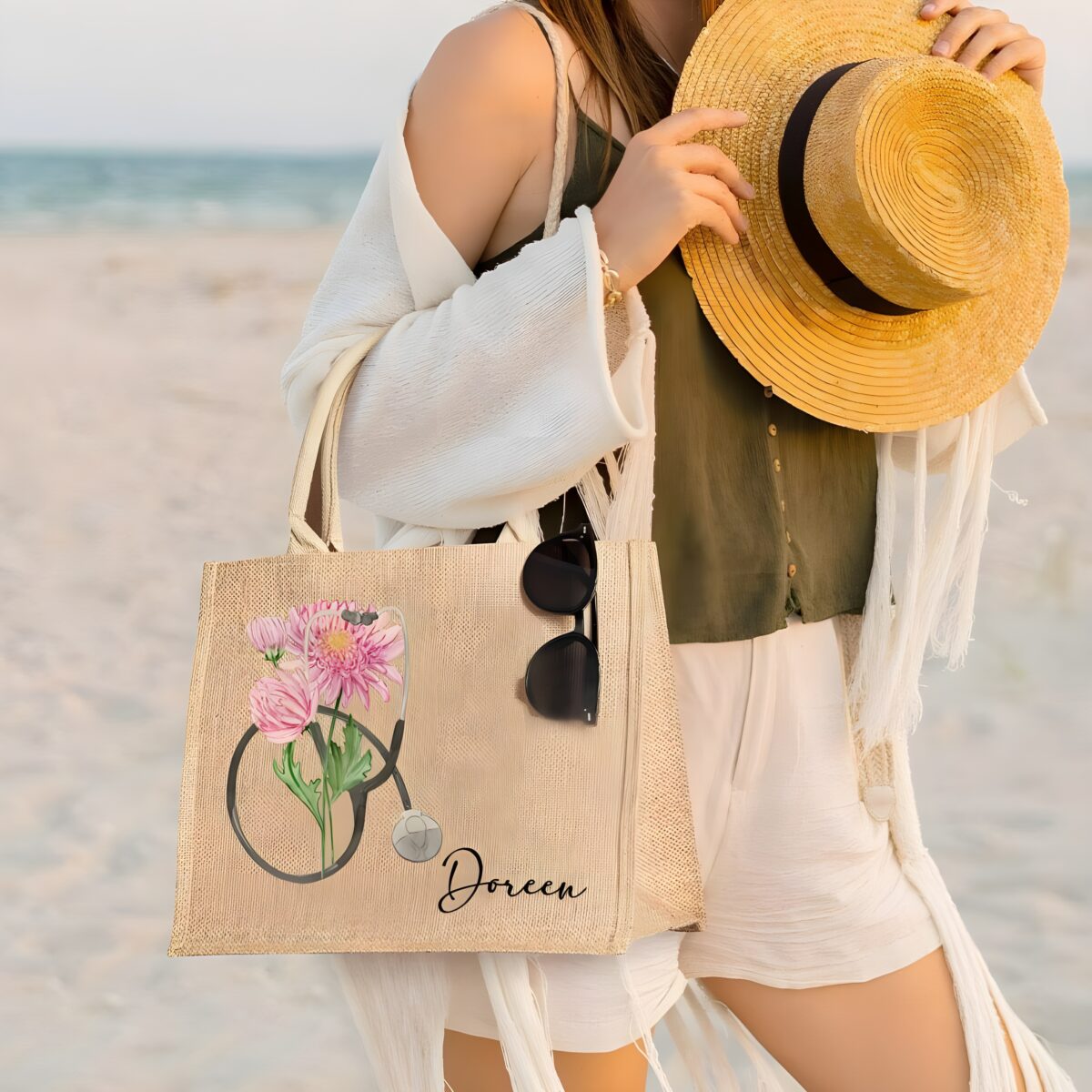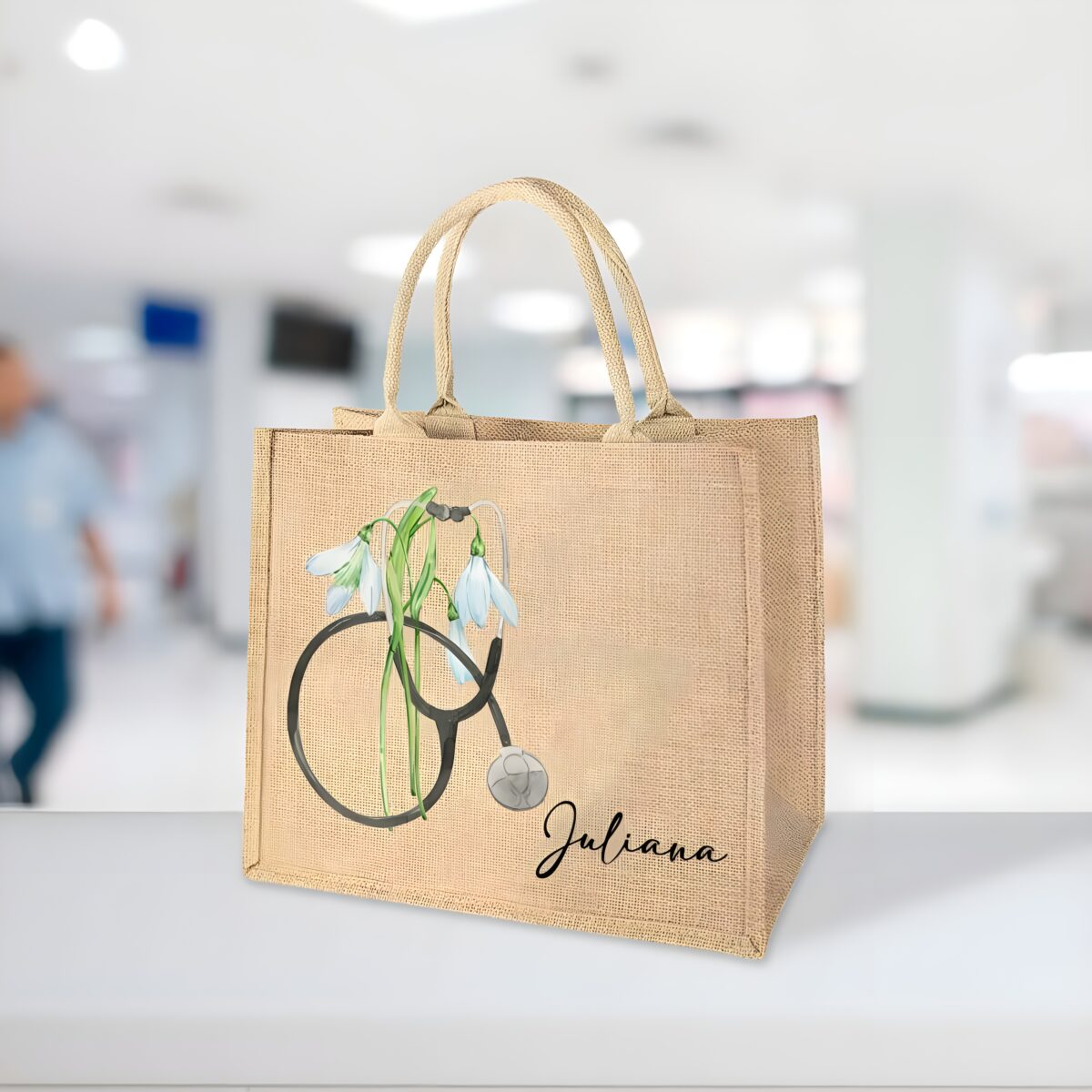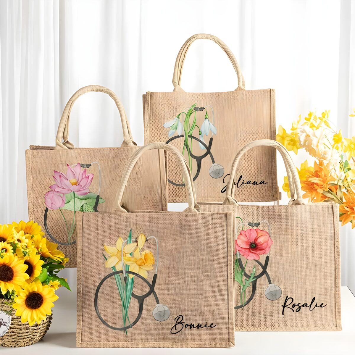 🌸 A stylish and eco-friendly personalized nurse tote bag made from burlap, featuring your birth flower, name, and a symbolic stethoscope design — a perfect gift for medical professionals.