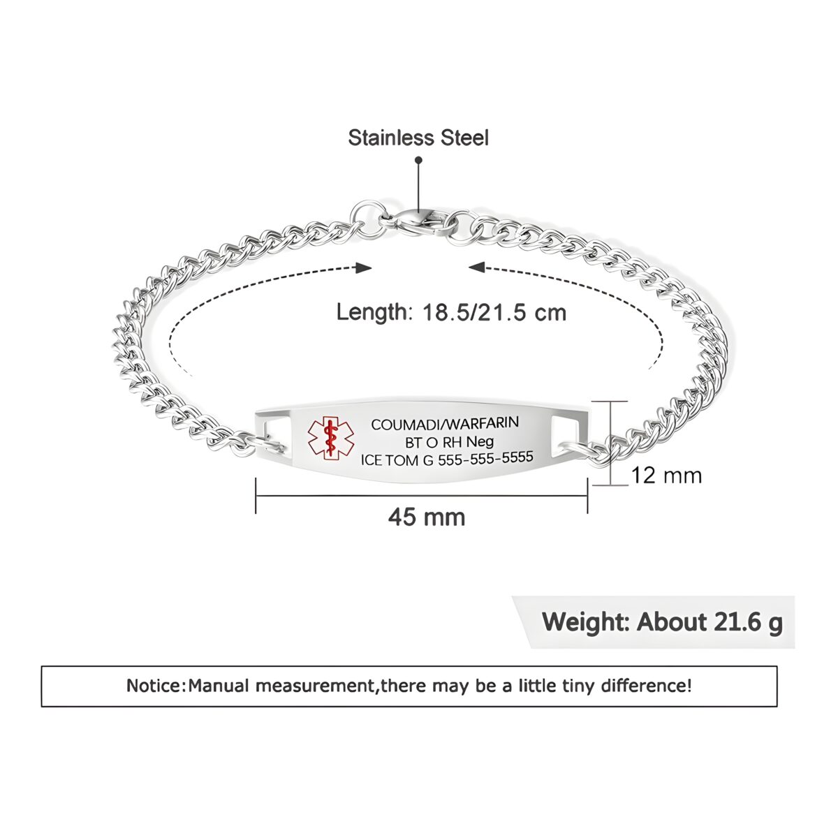 Measurements: Alert ID Size: 45*12MM (1.77*0.47INCH); Bracelet Chain Length (Alert ID Included): 18.5CM (7.28INCH) / 21.5CM (8.46INCH)