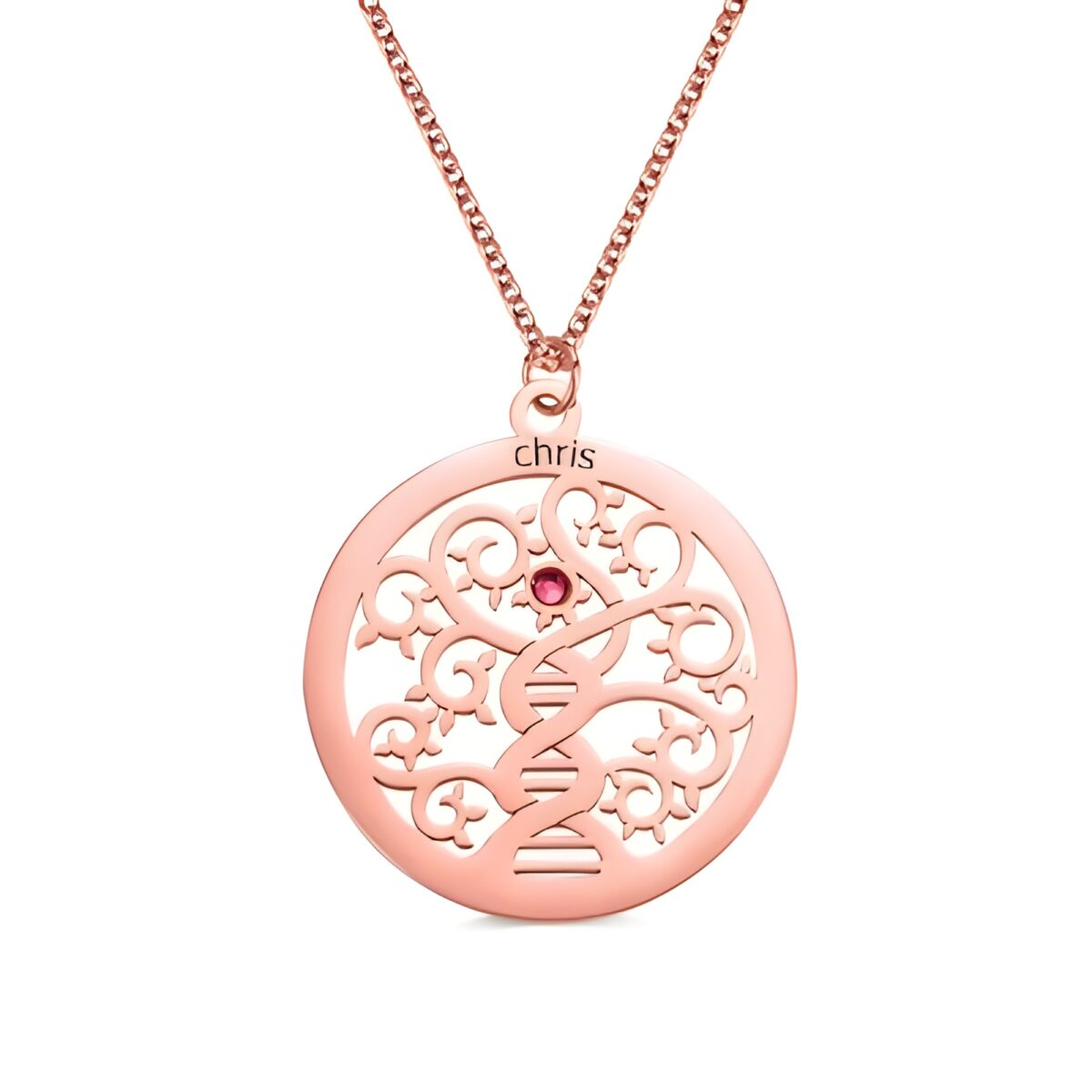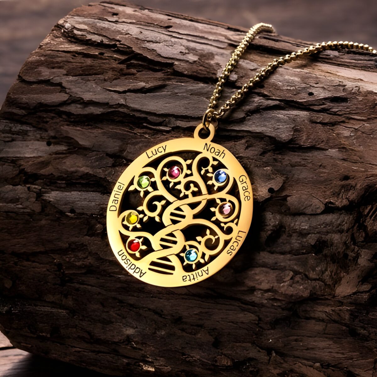 This exquisite necklace is a heartfelt tribute to the unbreakable bonds that tie your family together. Featuring a delicate family tree design intertwined with the timeless symbol of a double helix DNA, it beautifully honors the legacy and love shared across generations. Each birthstone represents a cherished family member’s birthday, making this piece a meaningful expression of your family’s enduring connection.