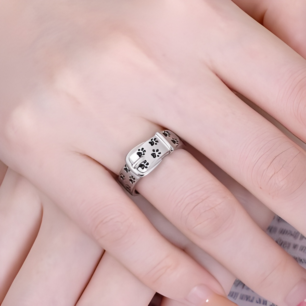 This delicate sterling silver ring, shaped like a pet collar and adorned with scattered pawprints, is a heartfelt tribute to the special connection you share with your beloved companion. It speaks of moments filled with joy and silent understanding, a constant reminder that your furry friend is always by your side.