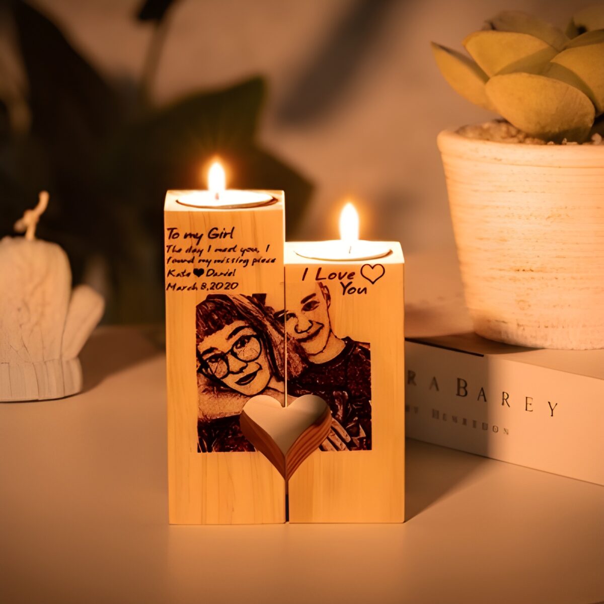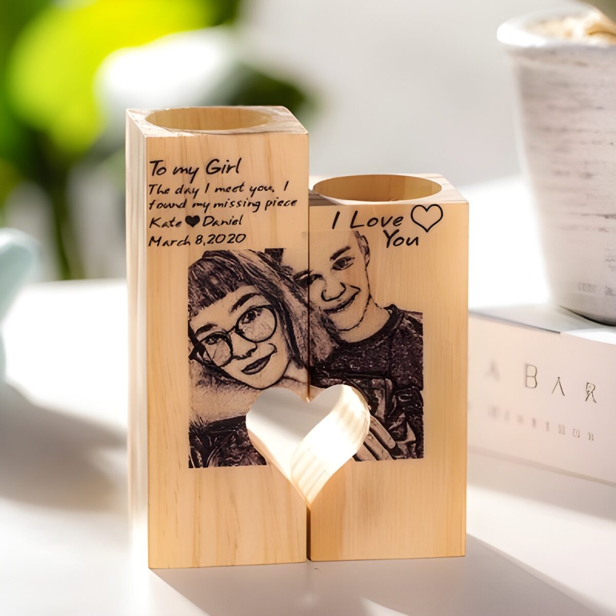 🕯️ Embrace your love with these custom photo wooden candlesticks, perfect for sharing warmth and memories in any home.