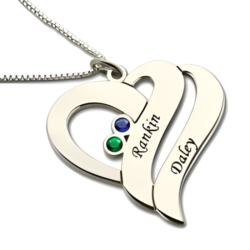 ❤️ Capture your unique bond with this double heart sterling silver necklace, personalized with names and colorful birthstones for a timeless expression of love.