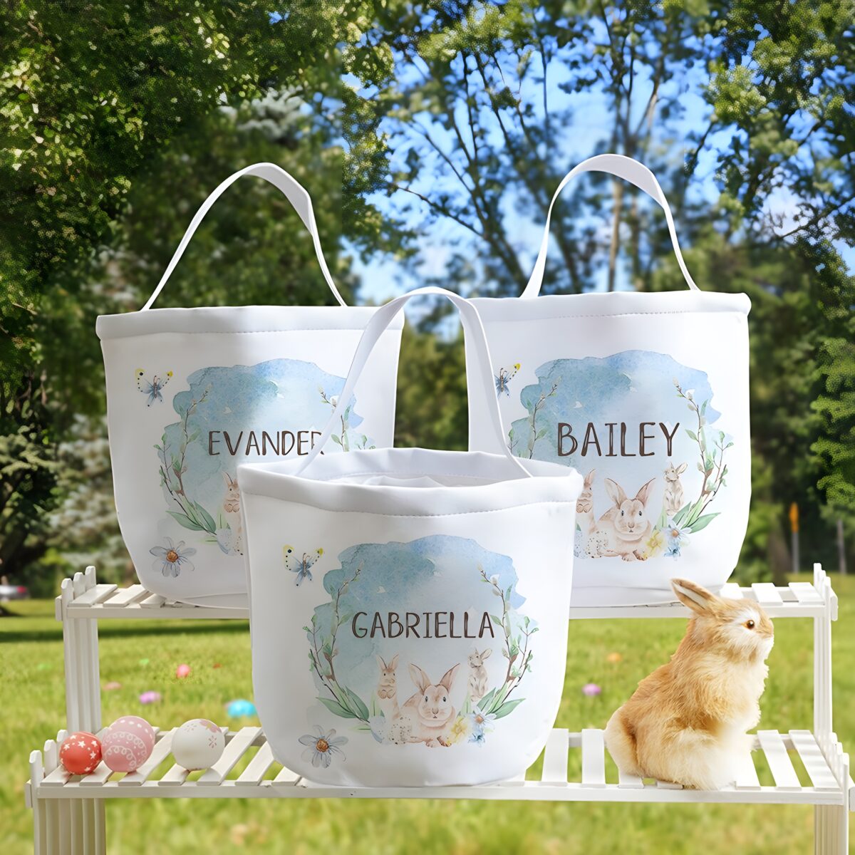 Easter Bunny Watercolor Bucket Bag – Custom Name Canvas Tote For Egg Hunts & Spring Gifts