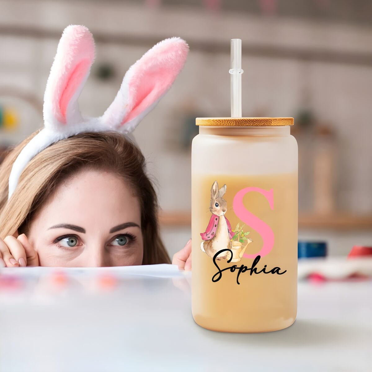 Sip in Style with a Personalized Easter Bunny Glass Cup – Frosted Tumbler with Bamboo Lid & Straw for Kids & Family