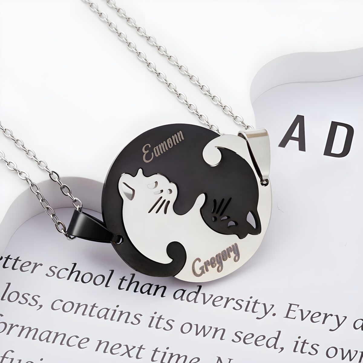 This necklace set beautifully intertwines sentiment and style, offering a tangible reminder of cherished relationships. The delicate embrace of the cats reflects the closeness shared between wearers, while the customizable names personalize the story they carry. Crafted the Eolante Way, it is more than jewelry—it’s a heartfelt celebration of love and connection.