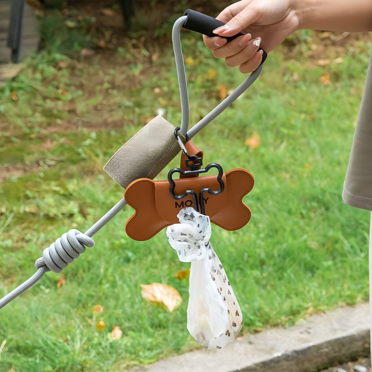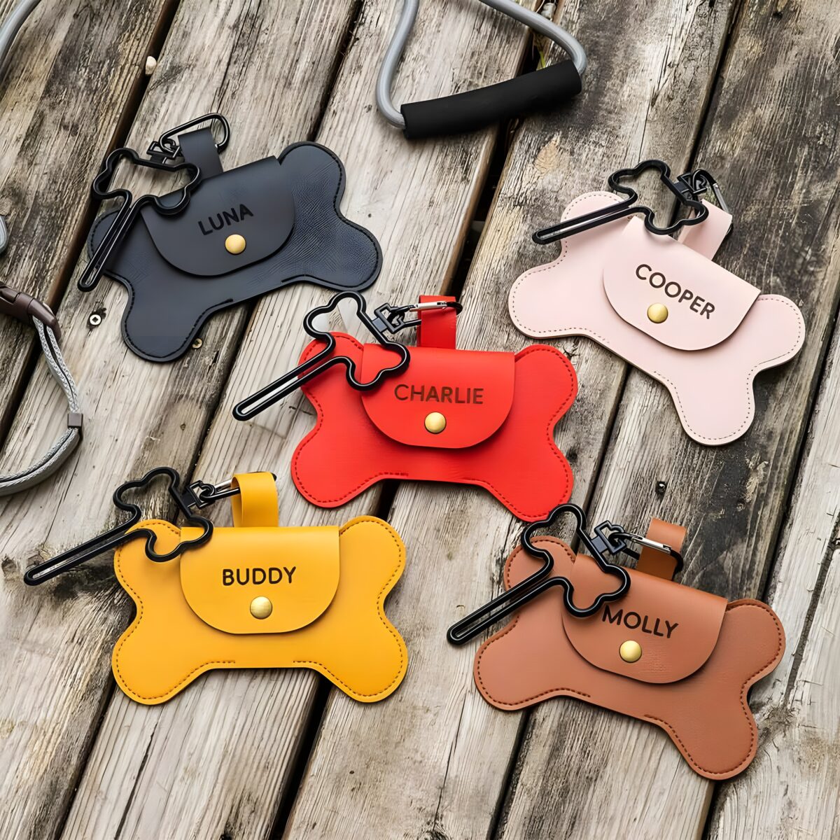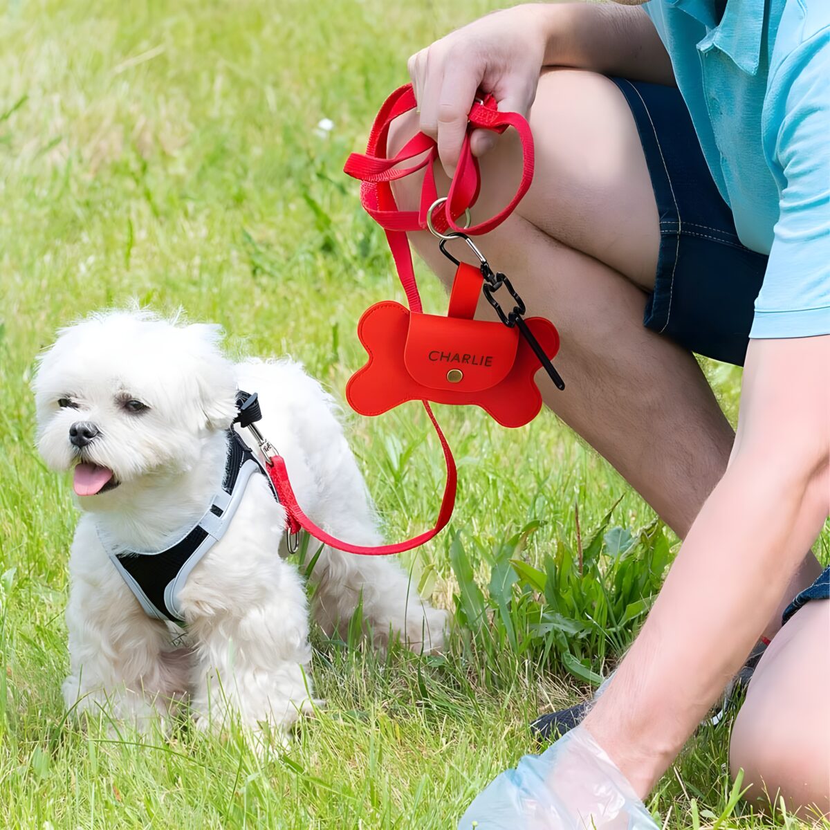 🐶 Keep your dog’s name close with this bone-shaped leather dog bag holder, a charming and durable accessory for every walk.
