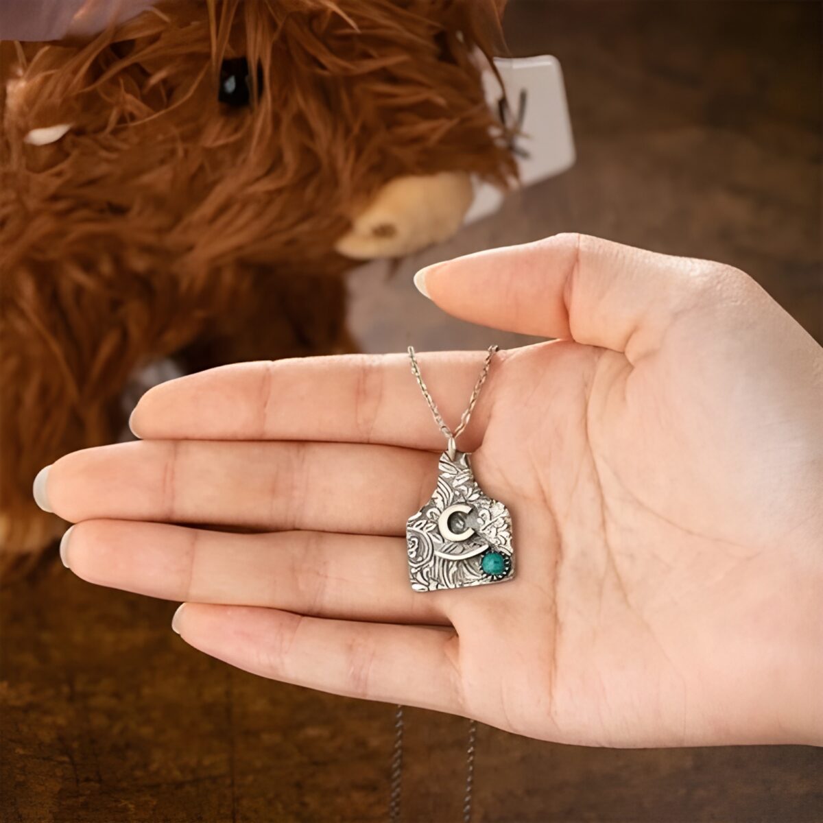 This sterling silver cattle tag necklace is crafted for the woman who carries strength and grace with every step. Designed with a delicate floral motif and adorned with natural turquoise, it captures a blend of rugged charm and refined beauty. Whether for a mom, daughter, girlfriend, or cherished friend, this piece tells a story as personal and unique as the initials it bears.