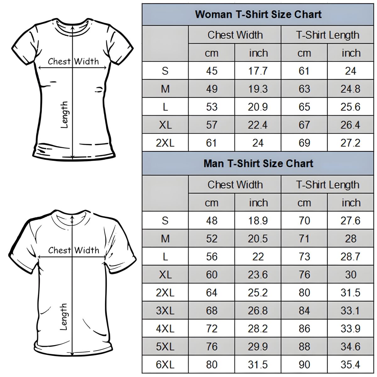 Measurements: Women: S/M/L/XL/2XL, Men: S/M/L/XL/2XL/3XL/4XL/5XL/6XL