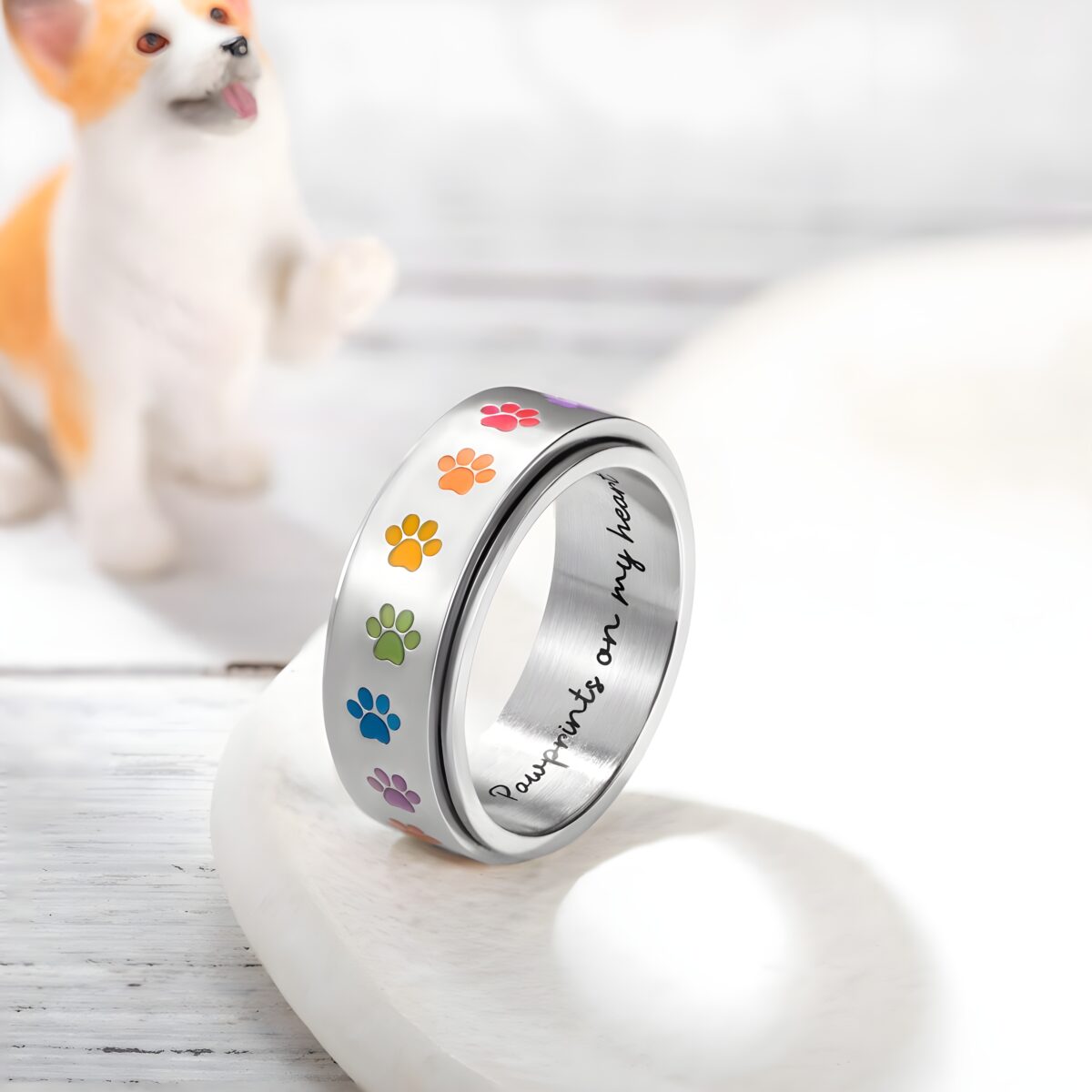 Carry Their Rainbow Spirit – Spinner Ring with Paw Prints – For Cherishing Pet Memories and Calm Moments