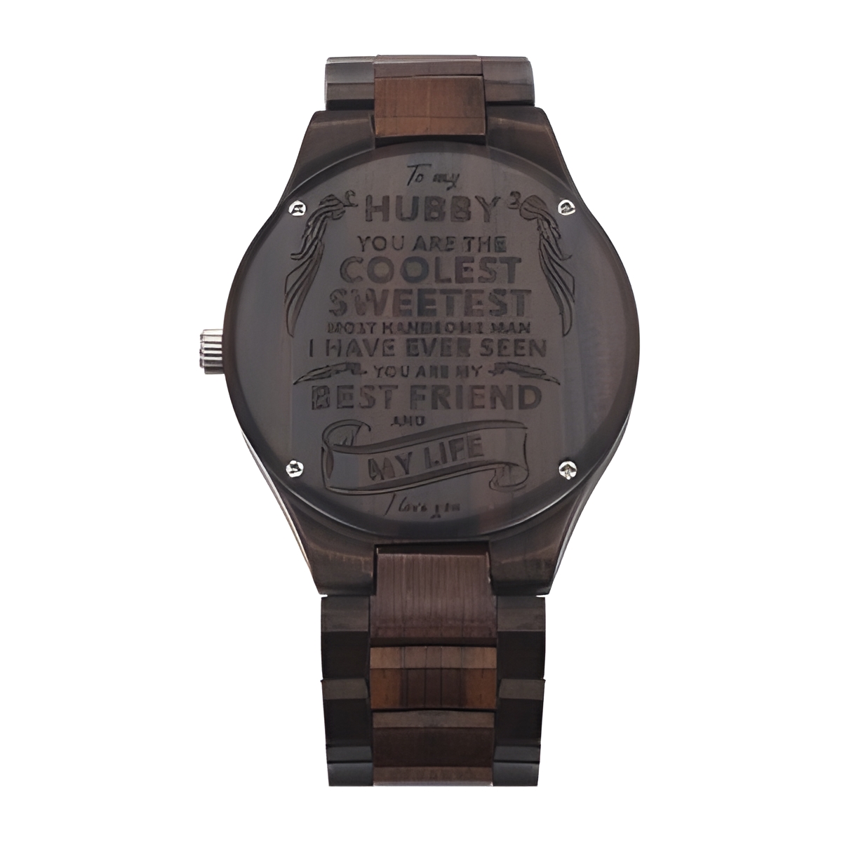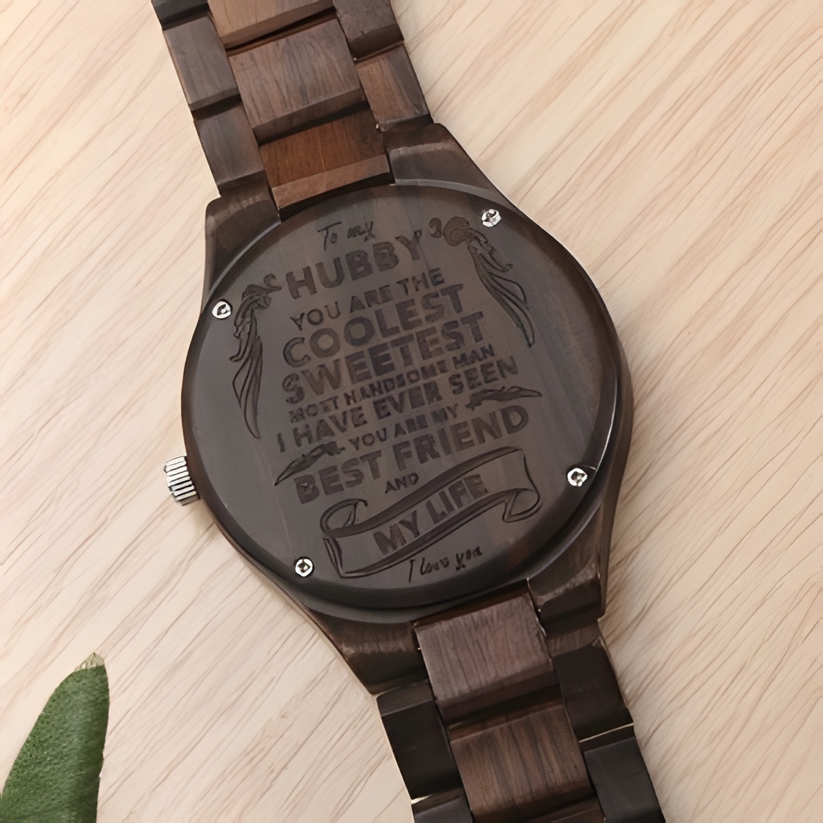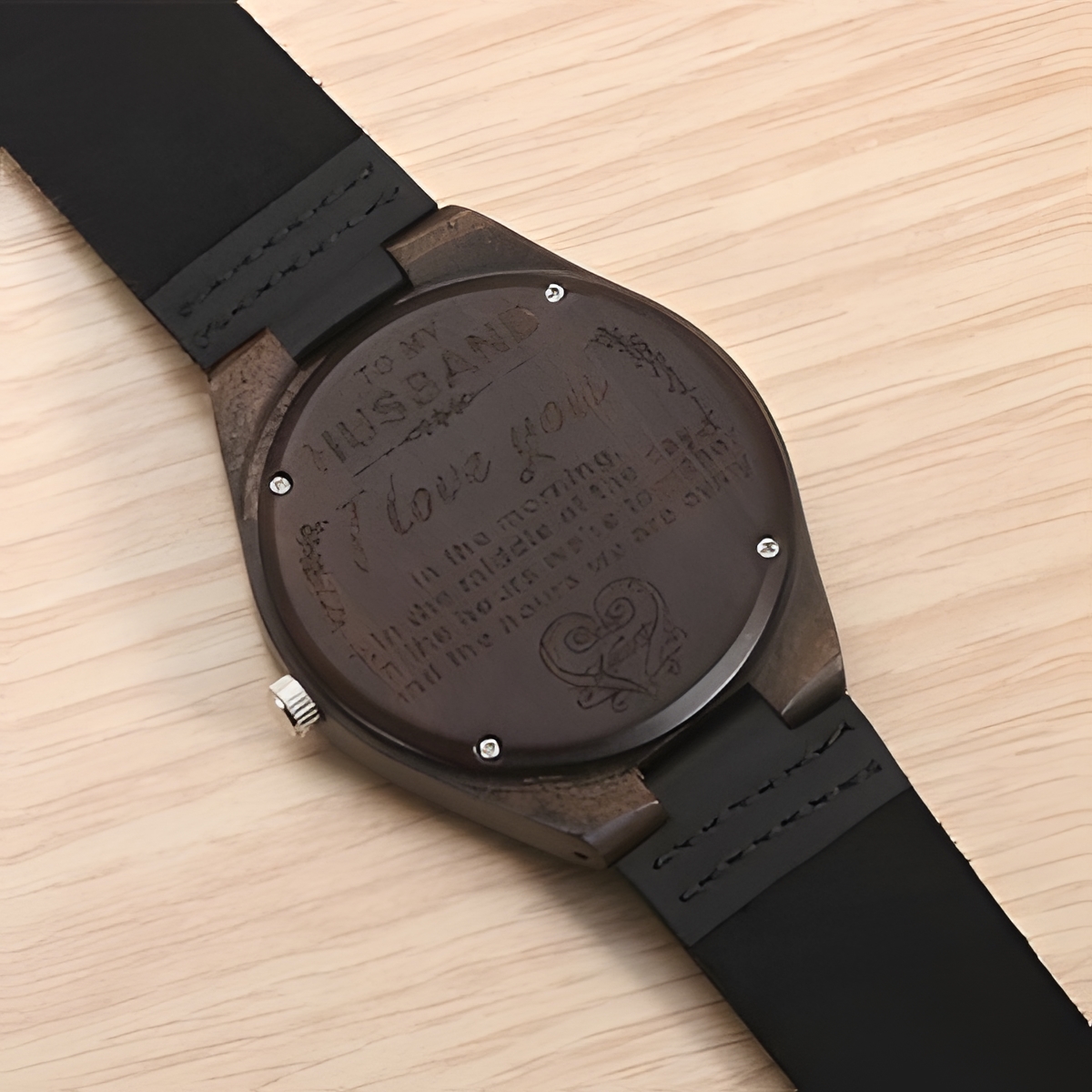 This ebony watch is more than a timepiece; it is a heartfelt expression of love and connection. Every tick carries your affection, making it a treasured keepsake for your husband to wear close to his heart. Thoughtfully crafted the Eolante Way, it blends natural beauty with meaningful personalization to celebrate your shared journey.