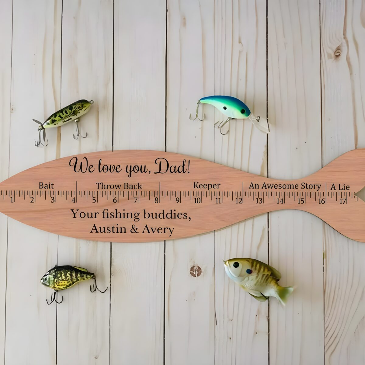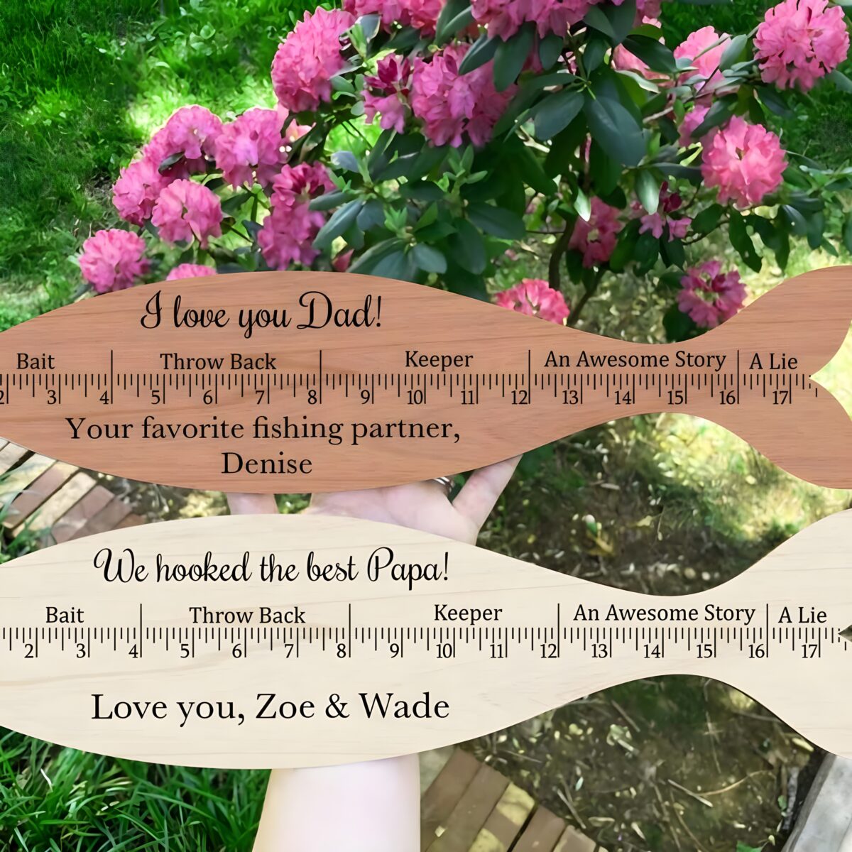 🎣 Capture special fishing moments with this handcrafted wooden fish ruler, personalized to celebrate dad or a beloved fishing buddy.
