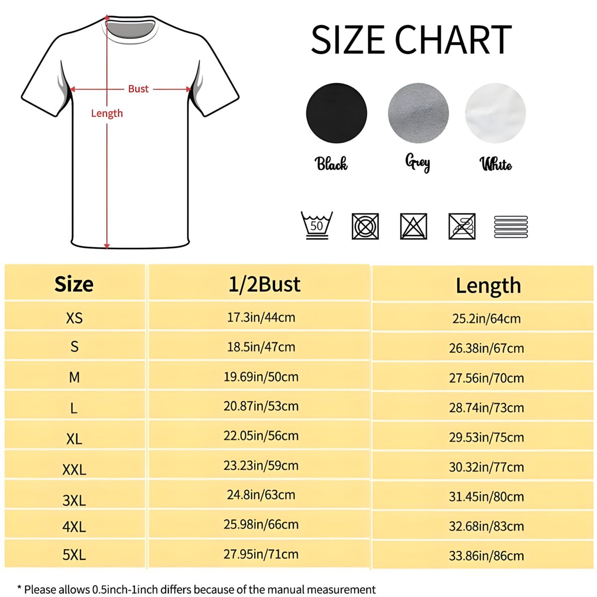 Measurements: XS, S, M, L, XL, 2XL, 3XL, 4XL, 5XL